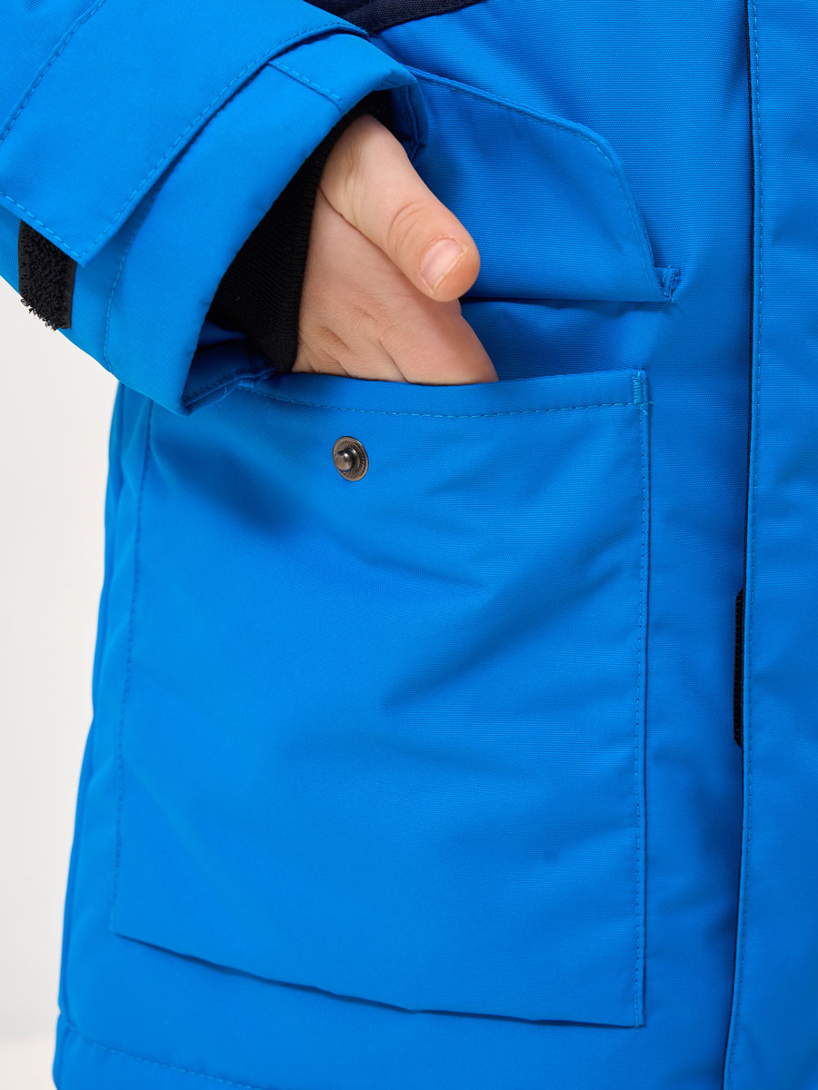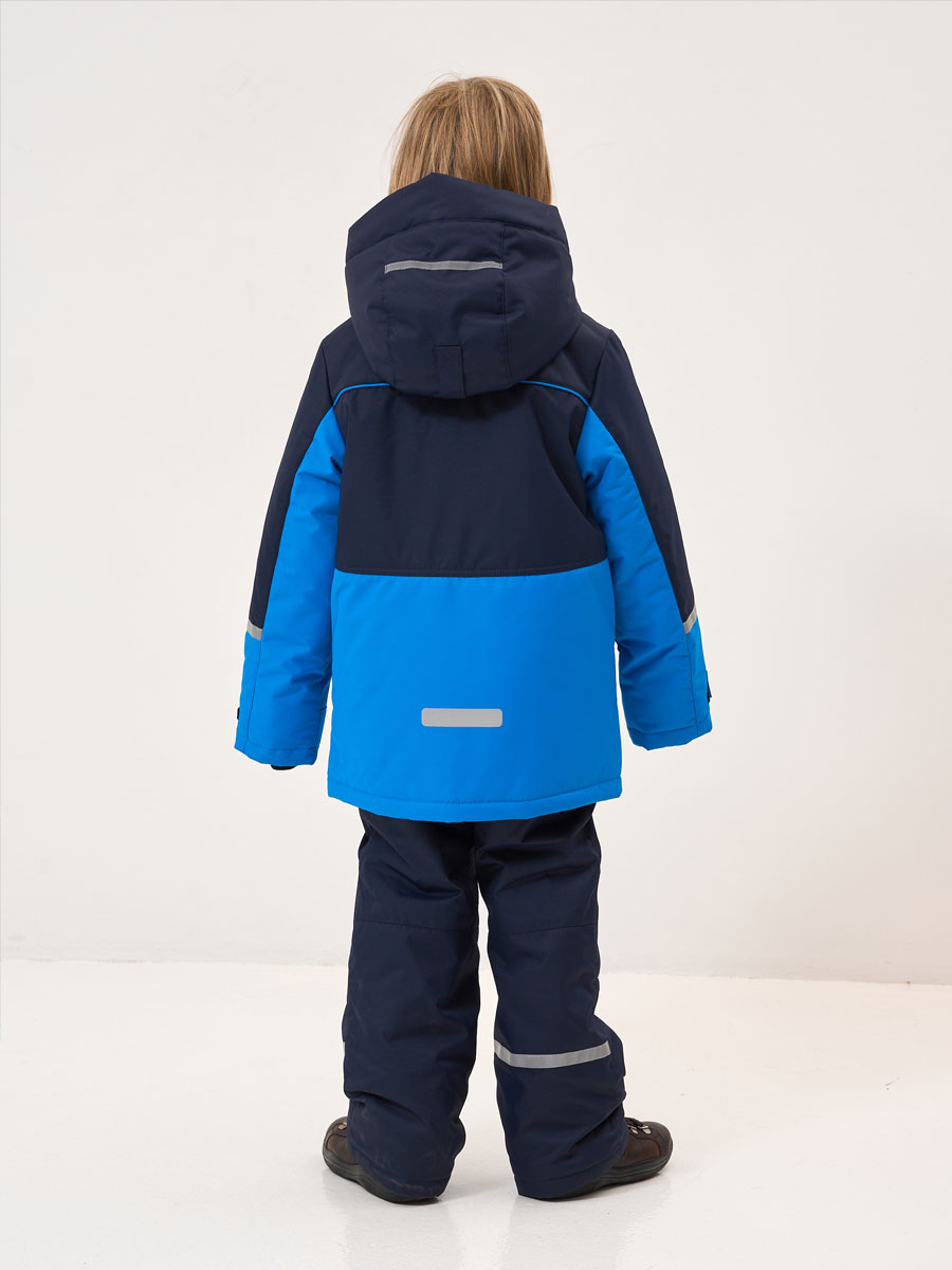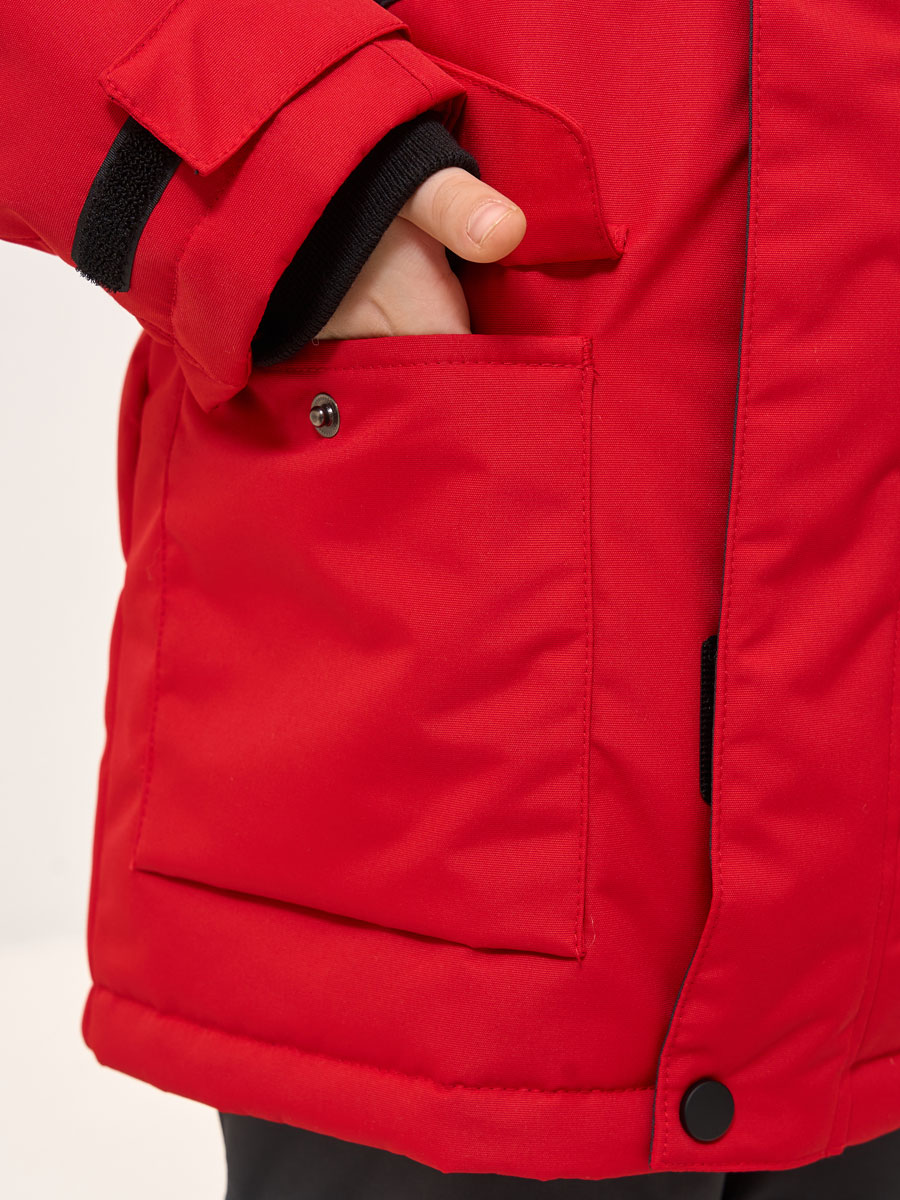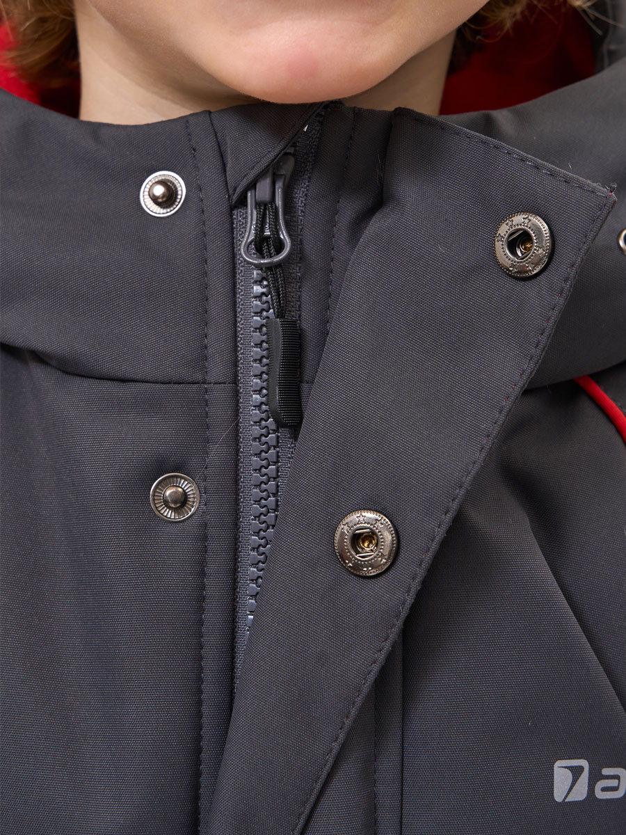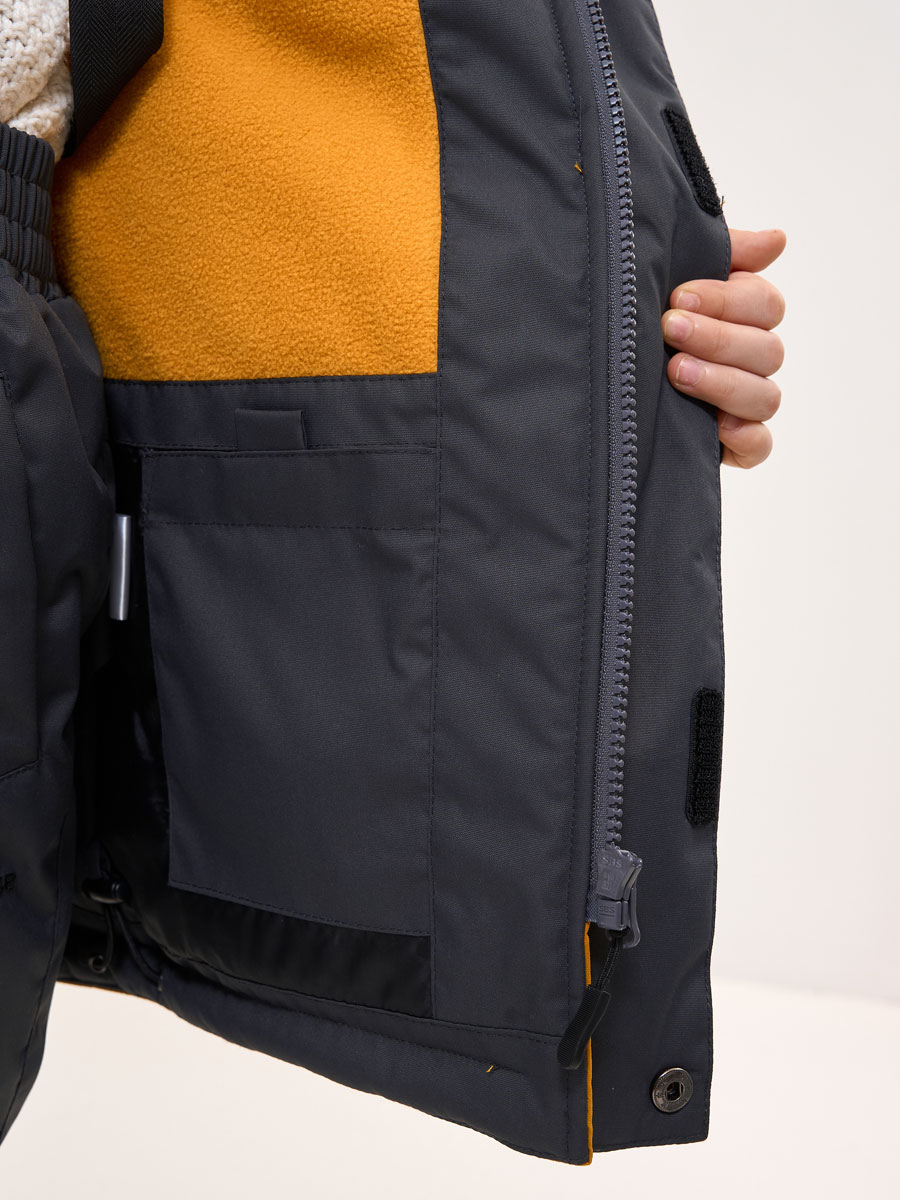 Куртка прямого силуэта, с втачным капюшоном. Застёжка на молнию, закрытая планкой на кнопках и липучках. 2 накладных кармана с клапаном на кнопке, 1 внутренний карман с липучкой. Подкладка из цветного флиса. В подкладке помочи из тесьмы для ношения куртки за плечами.