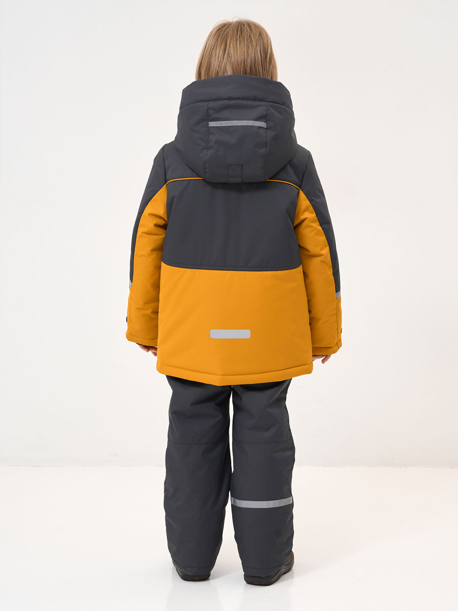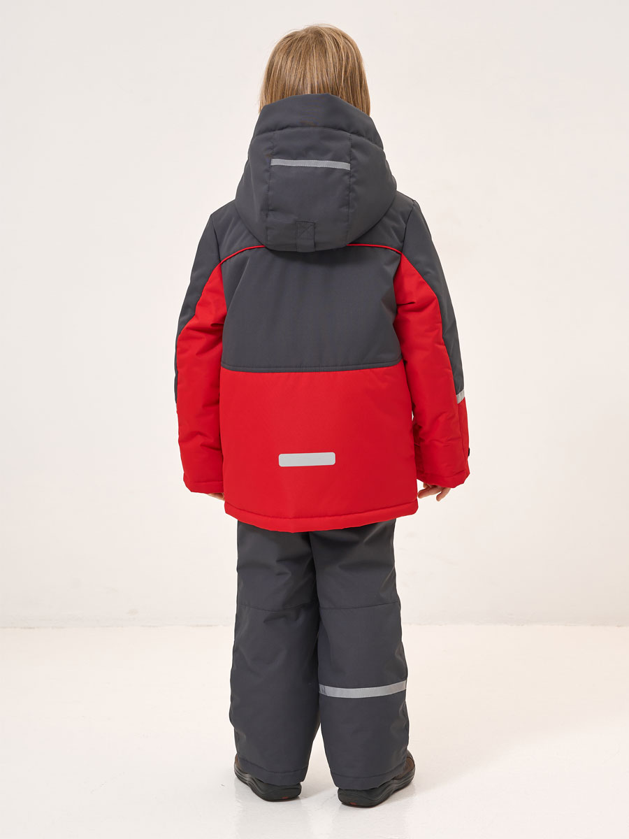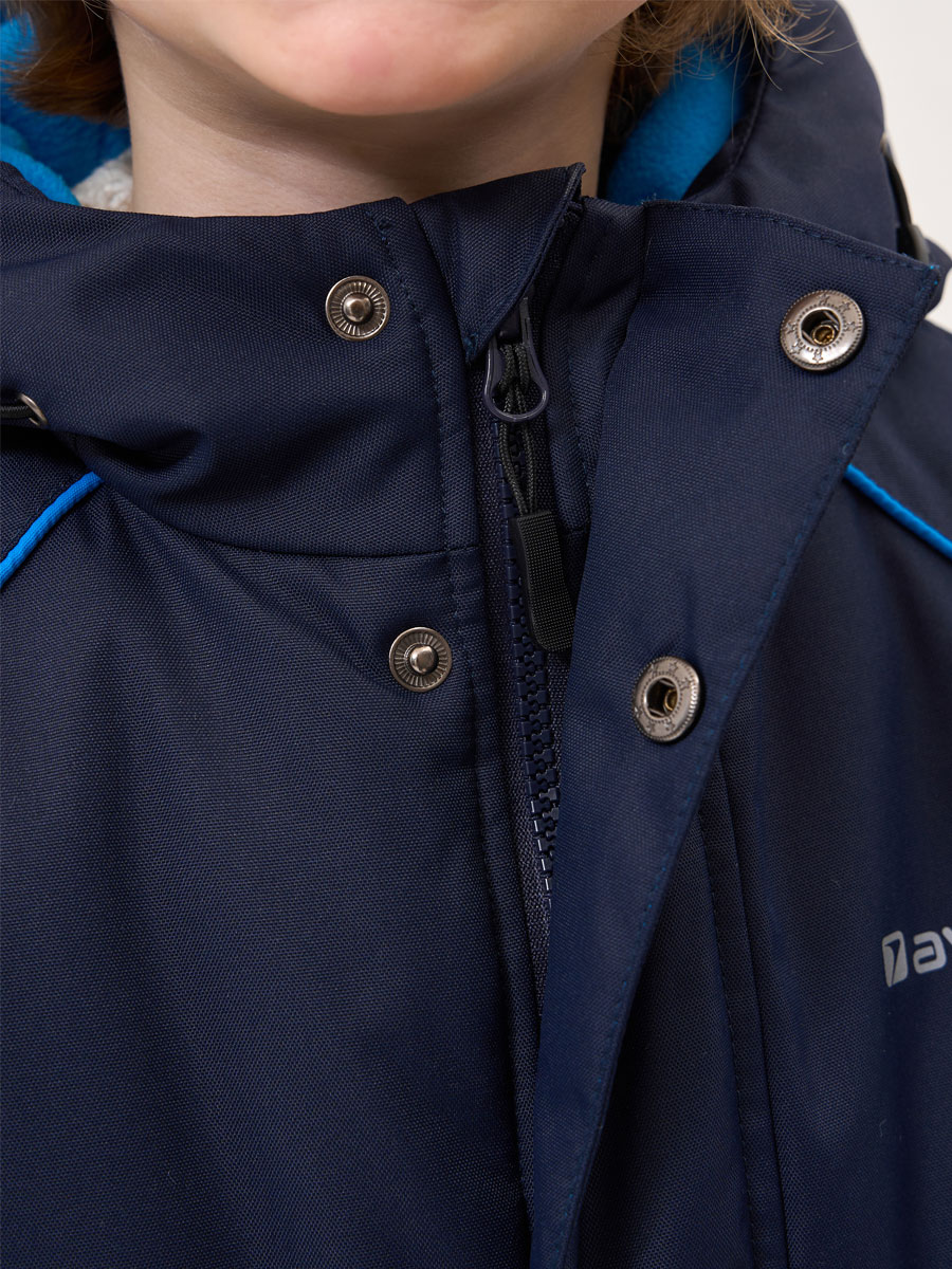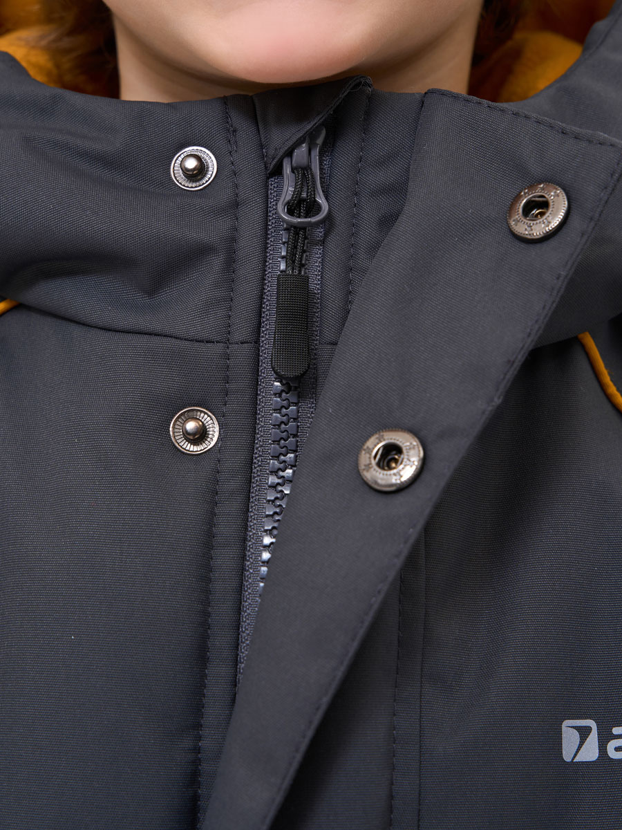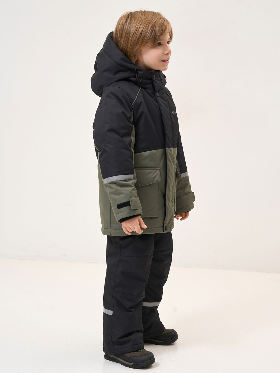Куртка прямого силуэта, с втачным капюшоном. Застёжка на молнию, закрытая планкой на кнопках и липучках. 2 накладных кармана с клапаном на кнопке, 1 внутренний карман с липучкой. Подкладка из цветного флиса. В подкладке помочи из тесьмы для ношения куртки за плечами.