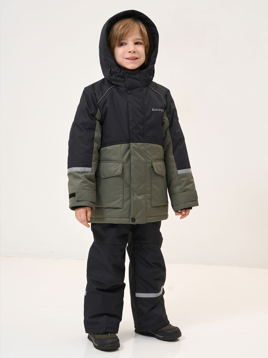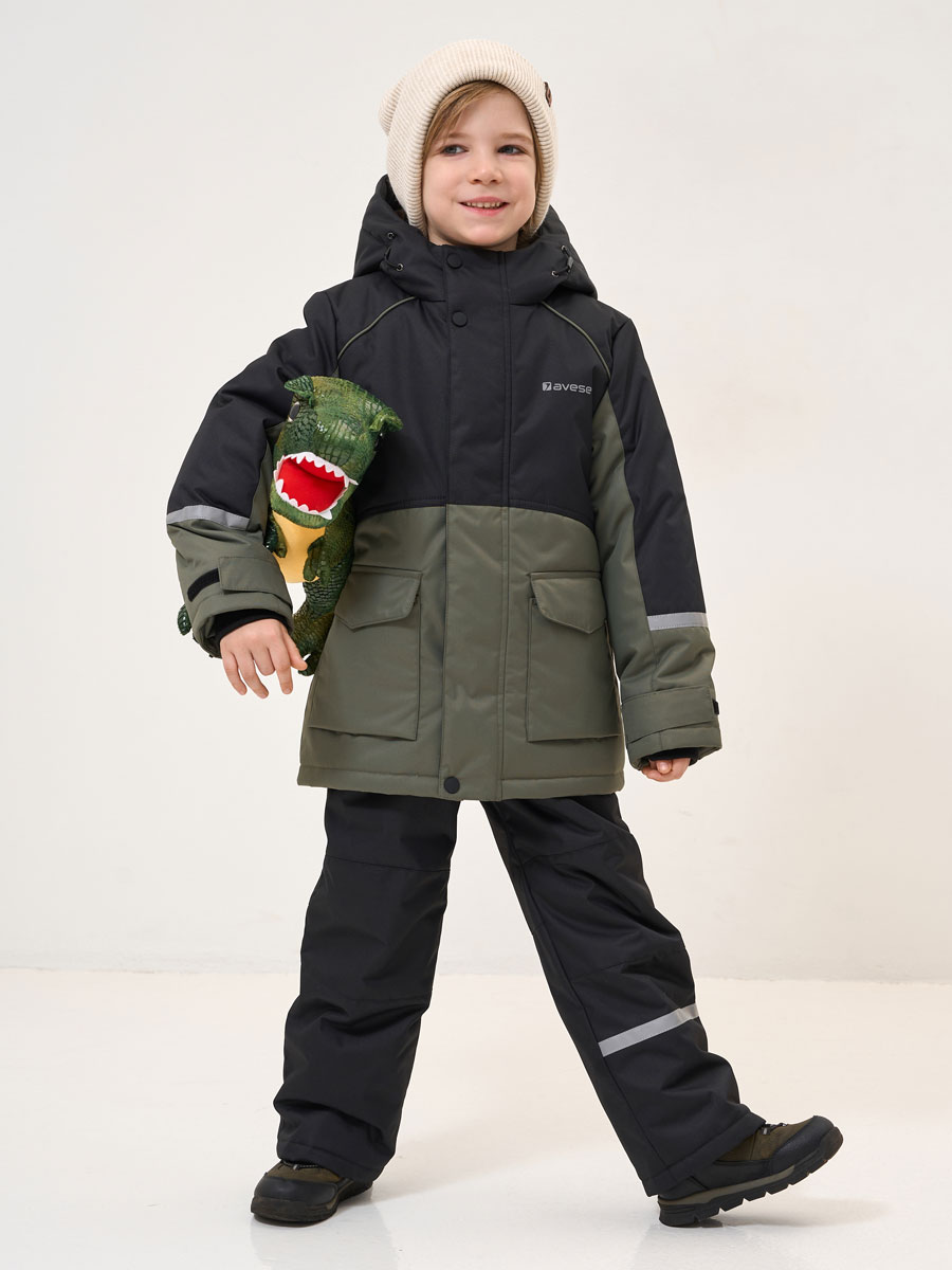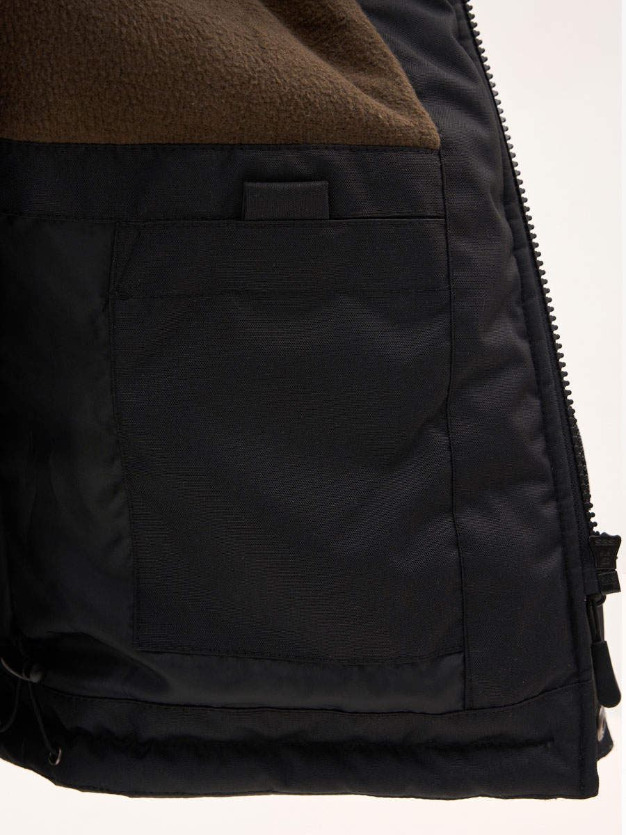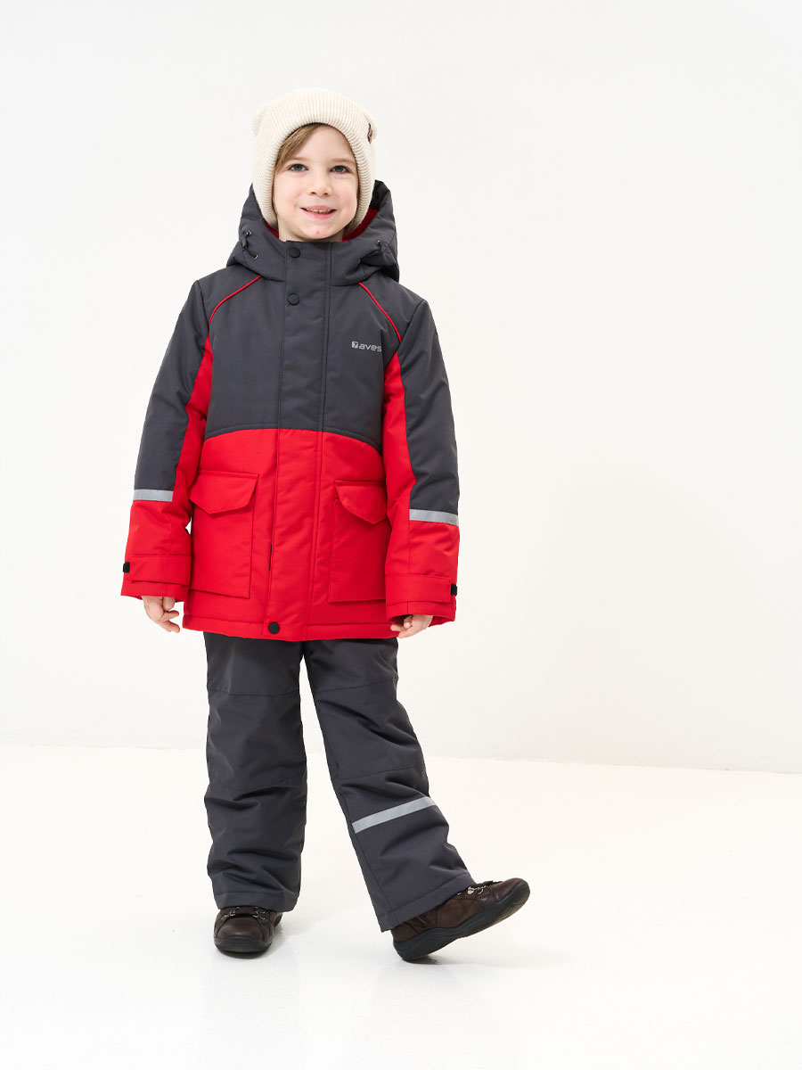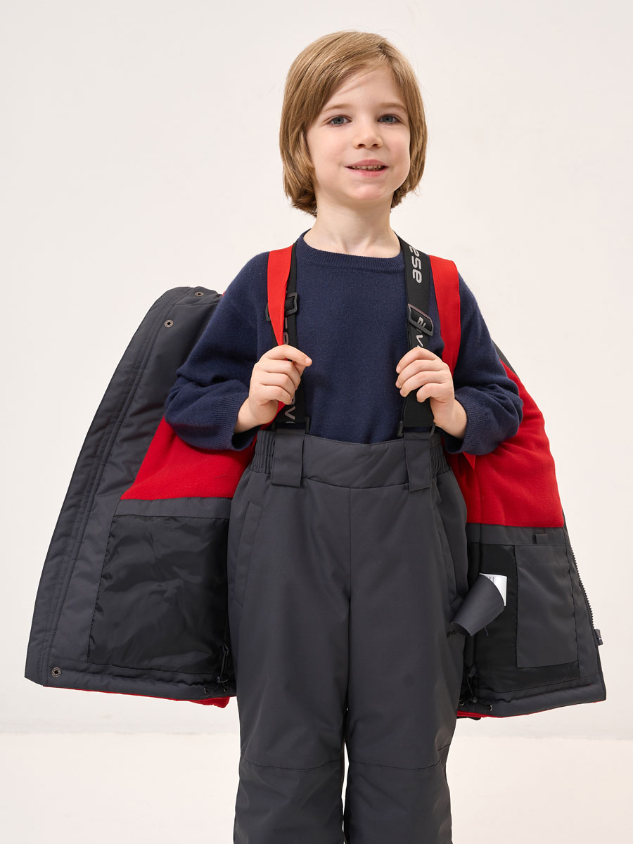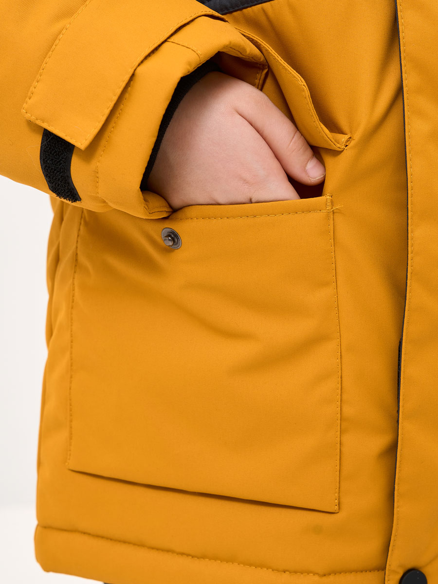 Куртка прямого силуэта, с втачным капюшоном. Застёжка на молнию, закрытая планкой на кнопках и липучках. 2 накладных кармана с клапаном на кнопке, 1 внутренний карман с липучкой. Подкладка из цветного флиса. В подкладке помочи из тесьмы для ношения куртки за плечами.