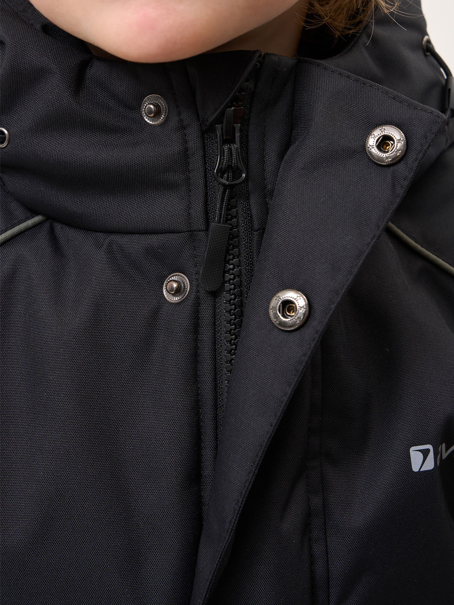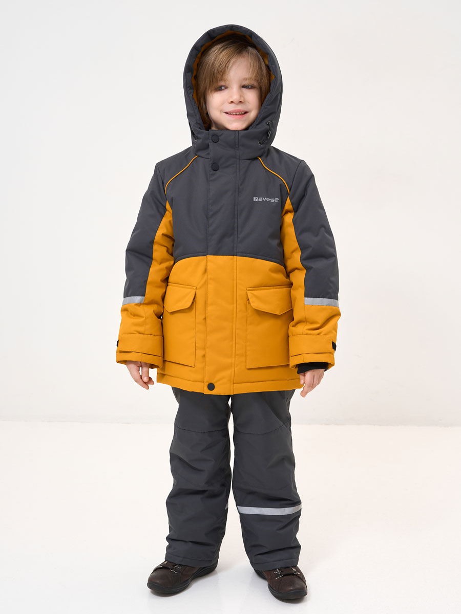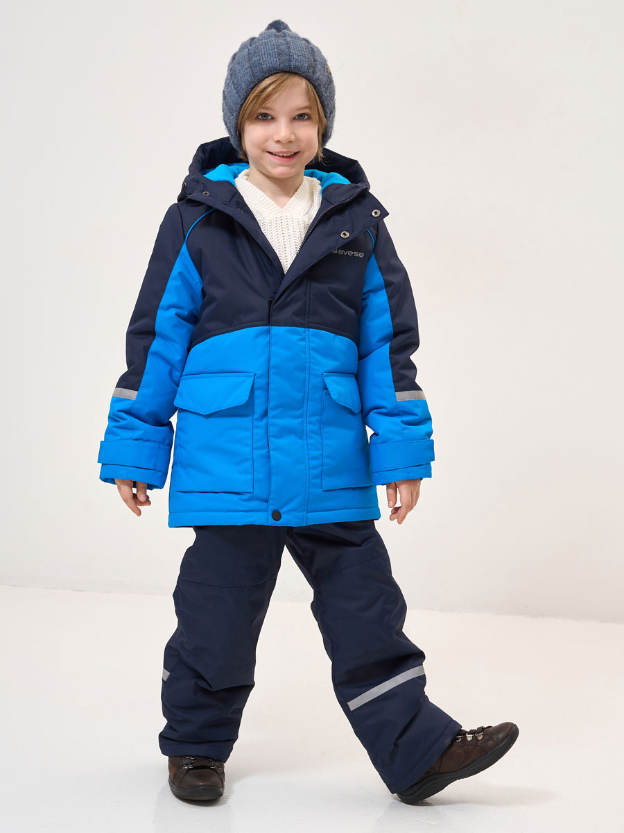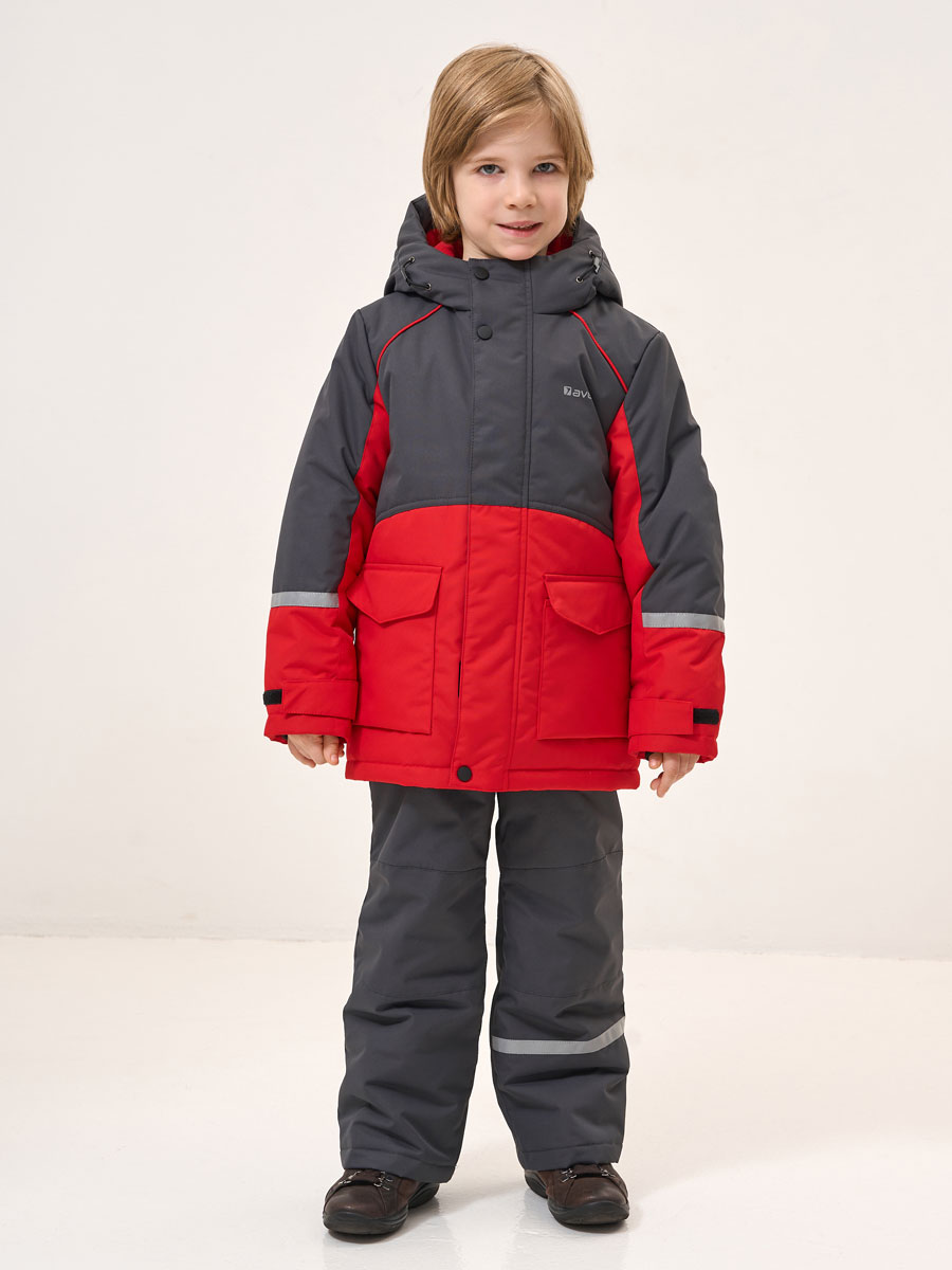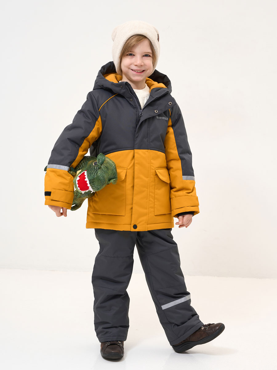 Куртка прямого силуэта, с втачным капюшоном. Застёжка на молнию, закрытая планкой на кнопках и липучках. 2 накладных кармана с клапаном на кнопке, 1 внутренний карман с липучкой. Подкладка из цветного флиса. В подкладке помочи из тесьмы для ношения куртки за плечами.