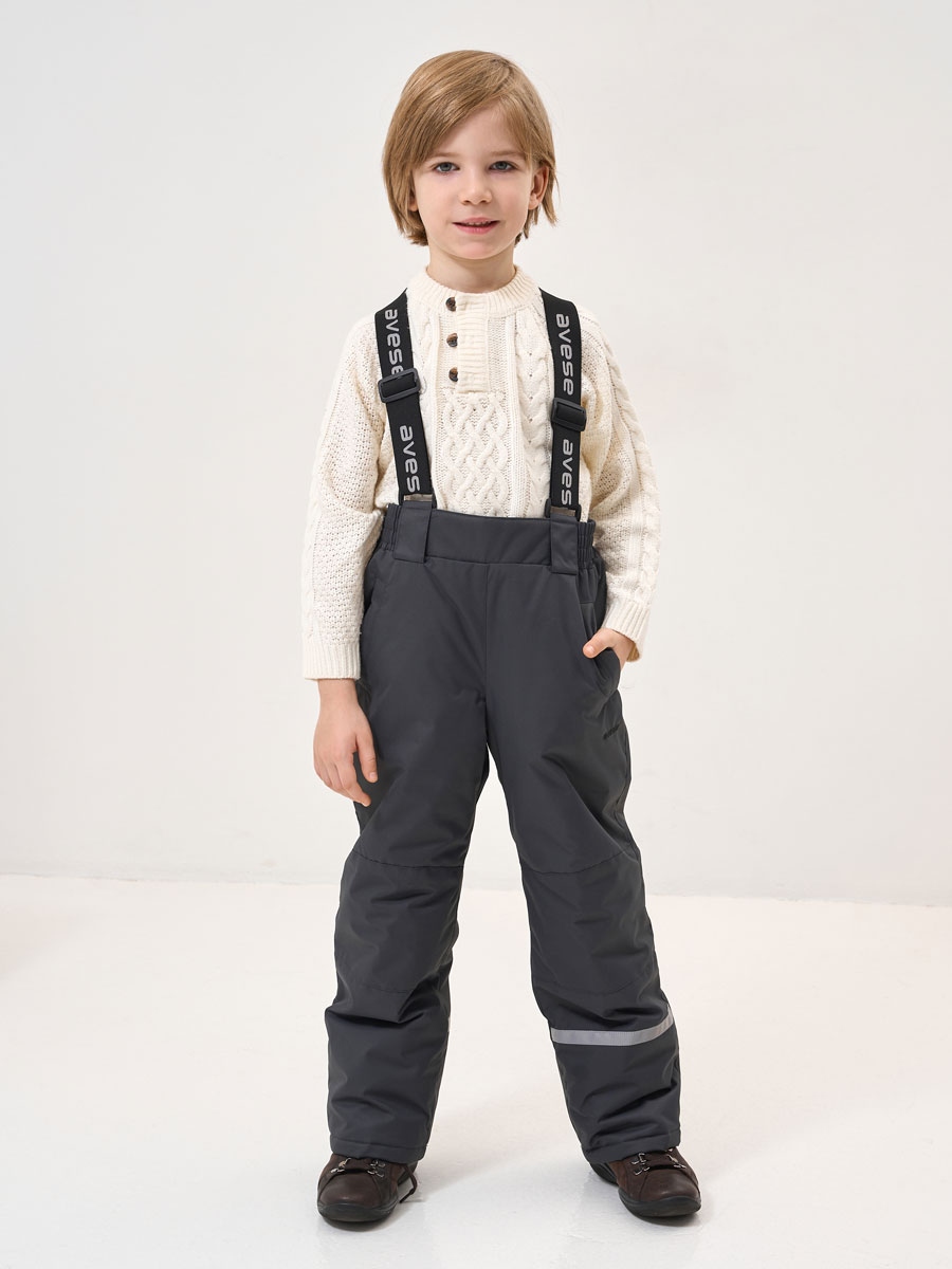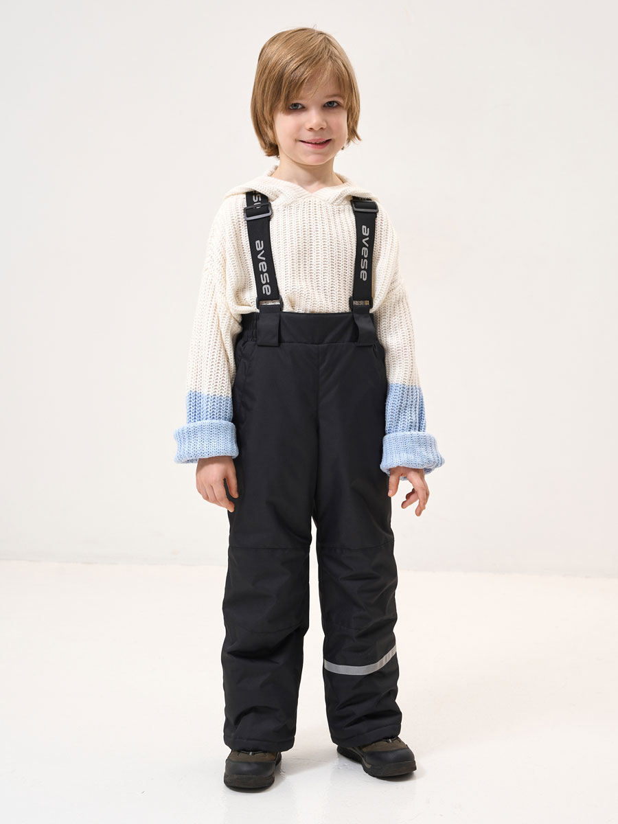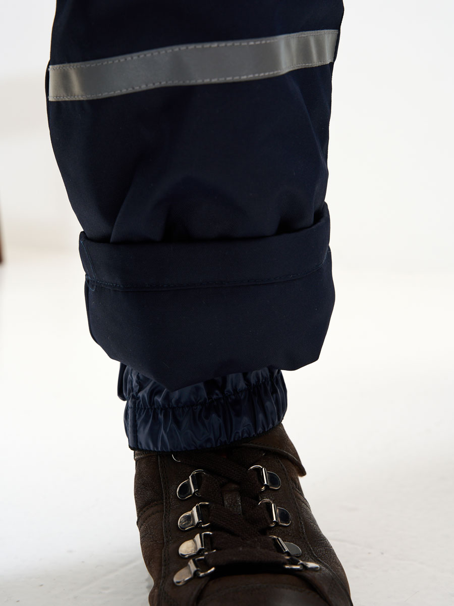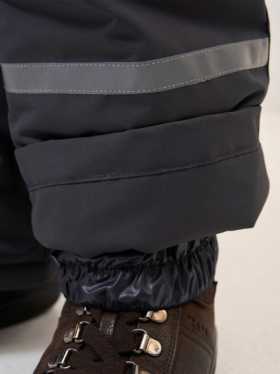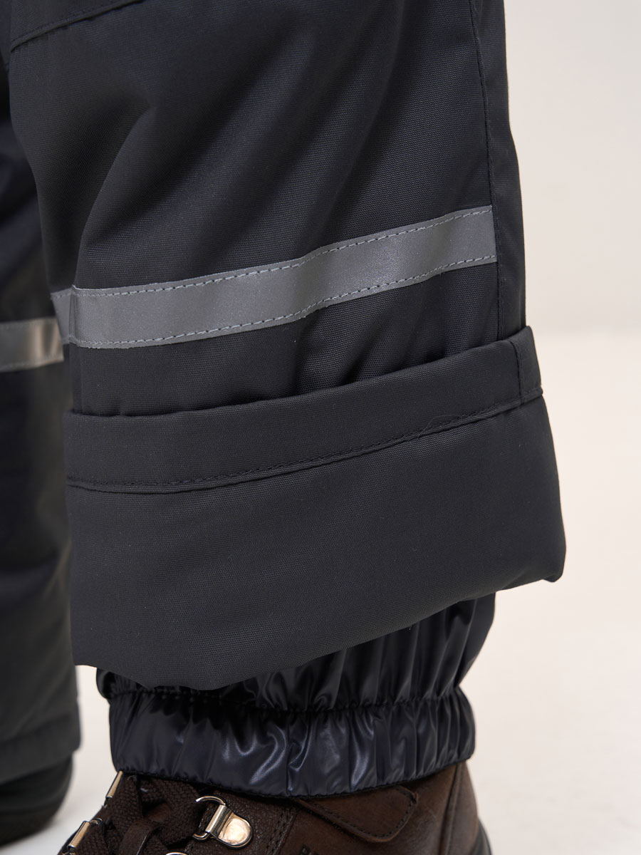 Брюки с отстегивающимися бретелями и спинкой. 2 прорезных кармана с листочками. Подкладка настегана на утеплитель. Пояс отрезной. Низ брюк прямой, с внутренней снегозащитной муфтой на стопорной резине. В костюме использованы светоотражающие элементы.