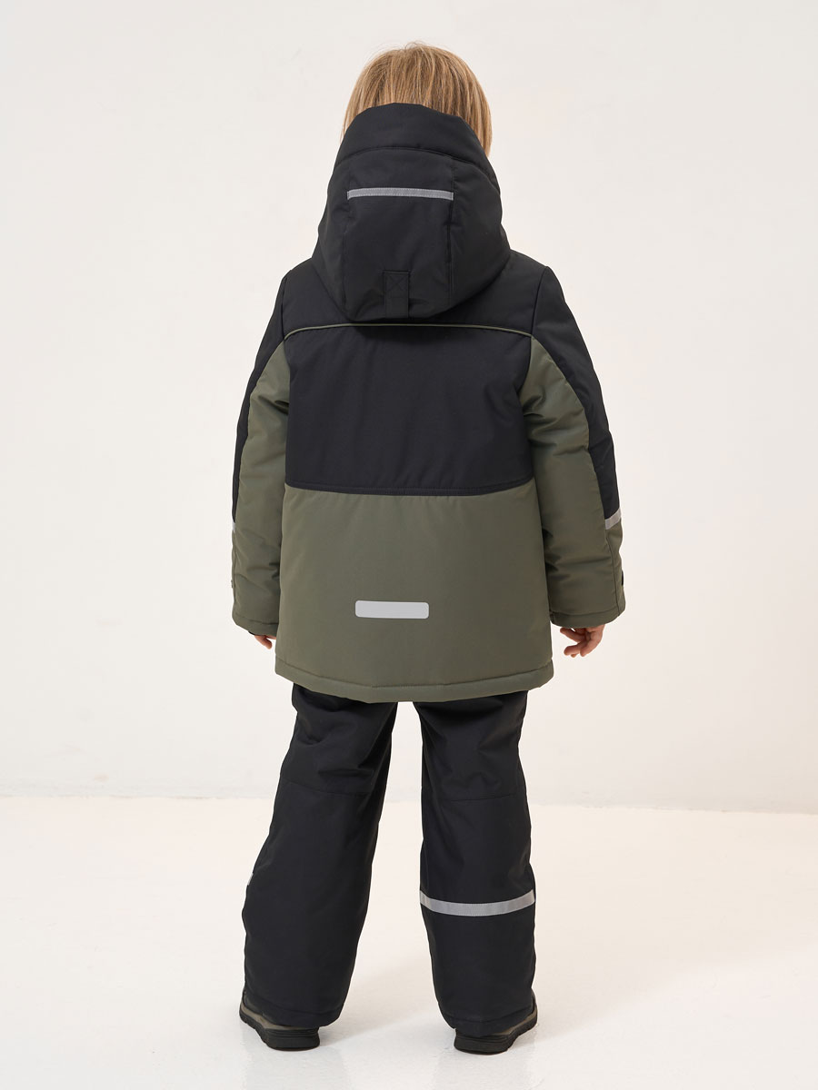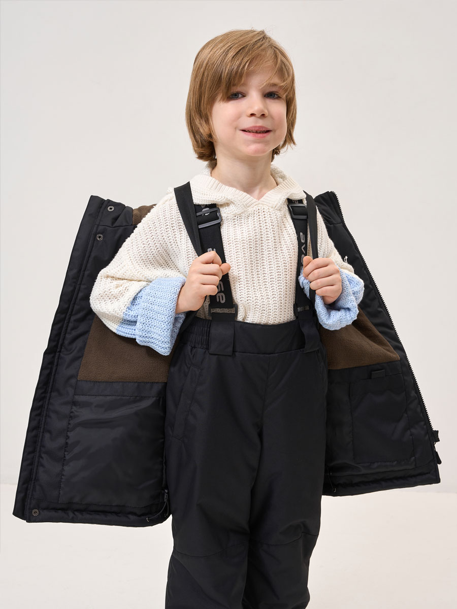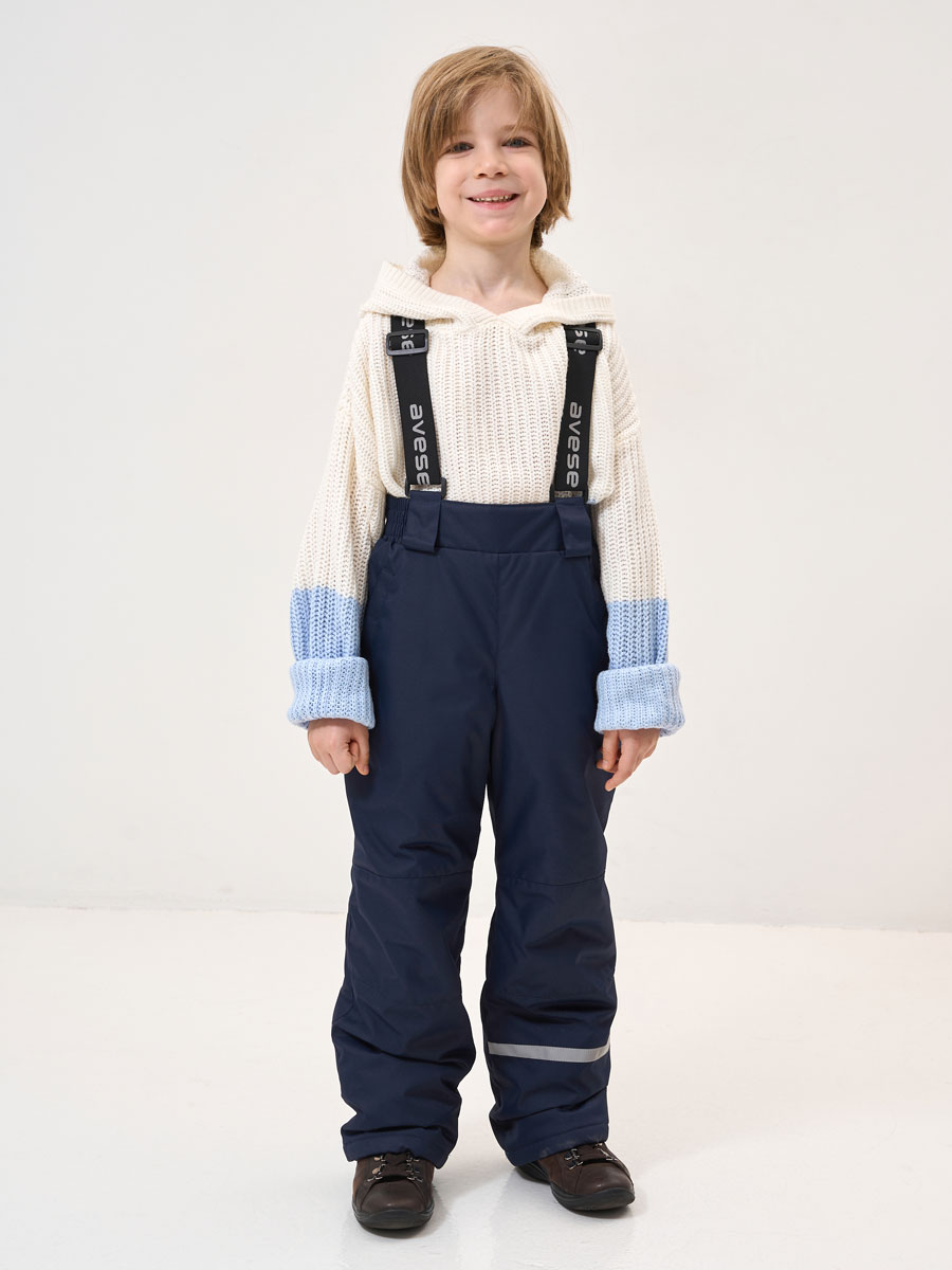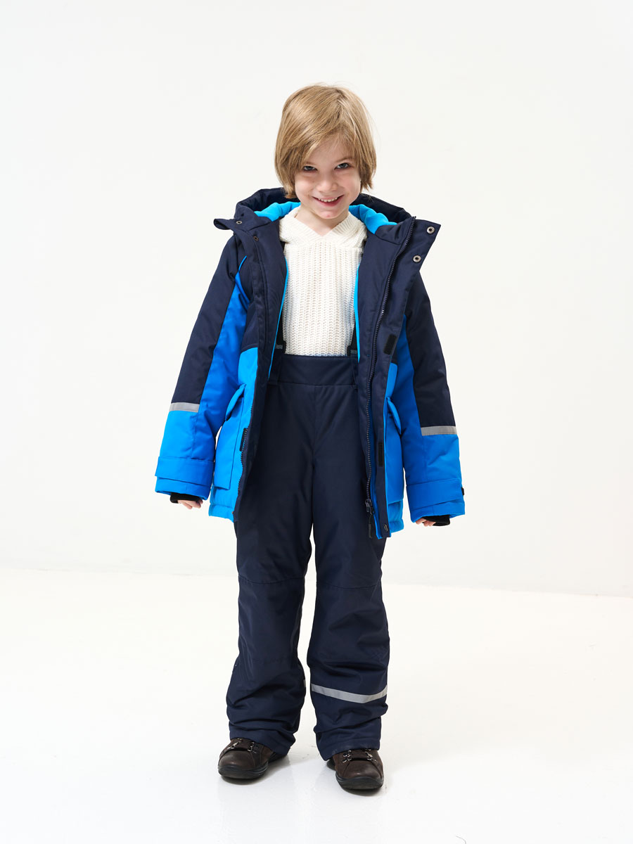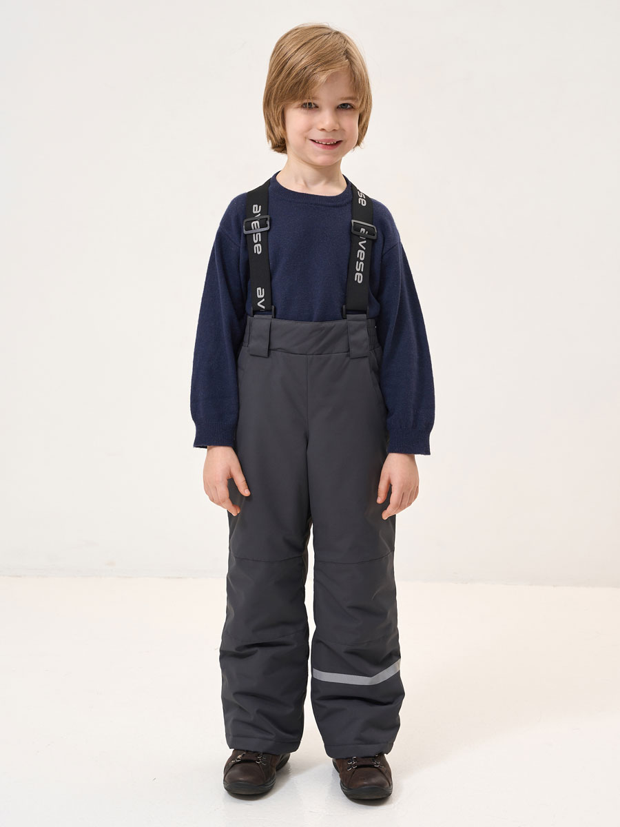 Брюки с отстегивающимися бретелями и спинкой. 2 прорезных кармана с листочками. Подкладка настегана на утеплитель. Пояс отрезной. Низ брюк прямой, с внутренней снегозащитной муфтой на стопорной резине. В костюме использованы светоотражающие элементы.