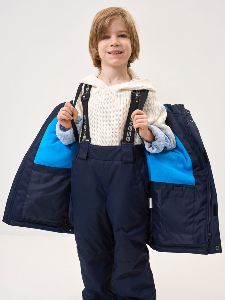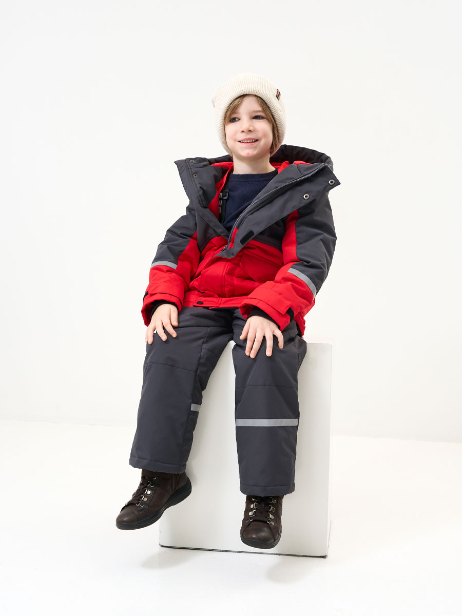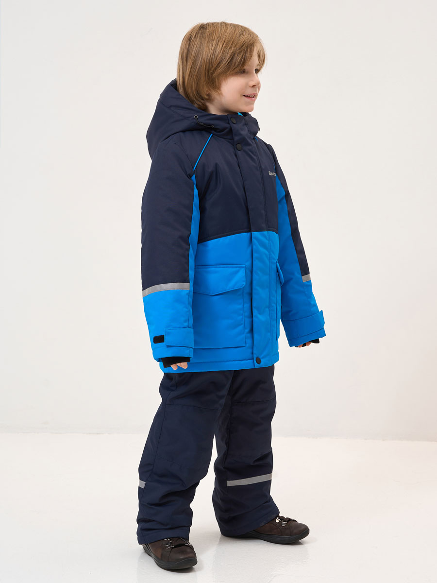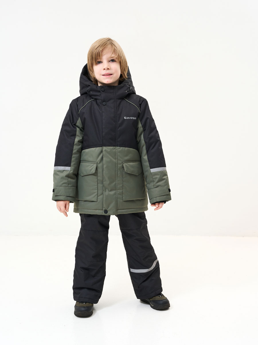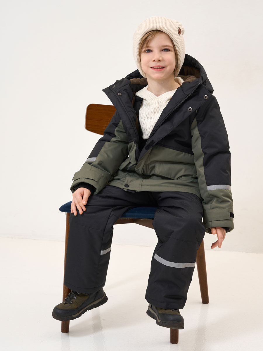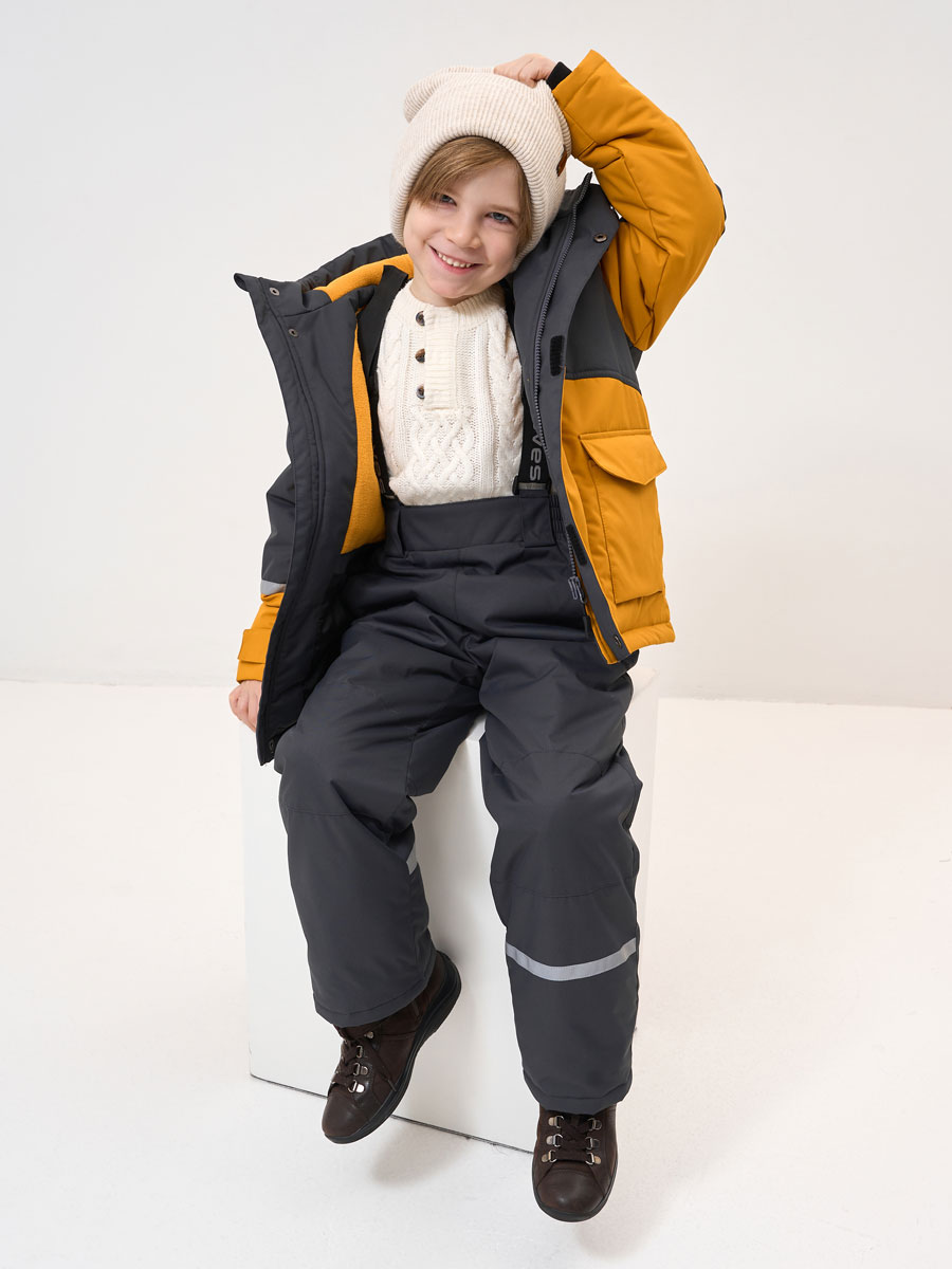 Брюки с отстегивающимися бретелями и спинкой. 2 прорезных кармана с листочками. Подкладка настегана на утеплитель. Пояс отрезной. Низ брюк прямой, с внутренней снегозащитной муфтой на стопорной резине. В костюме использованы светоотражающие элементы.