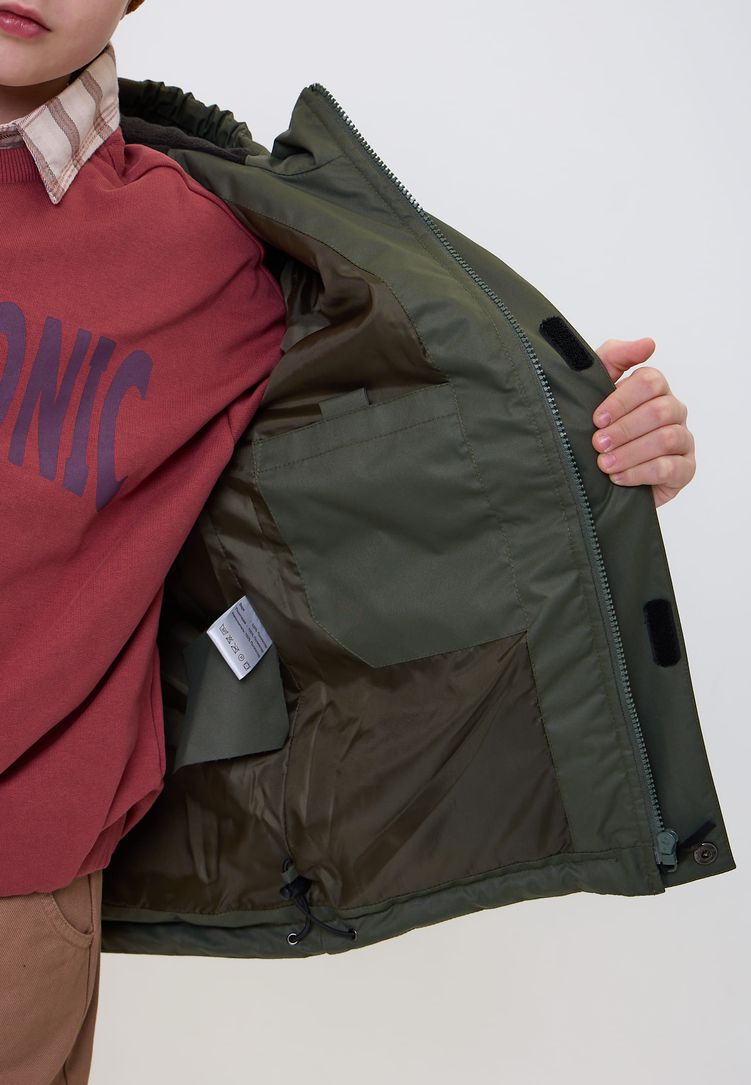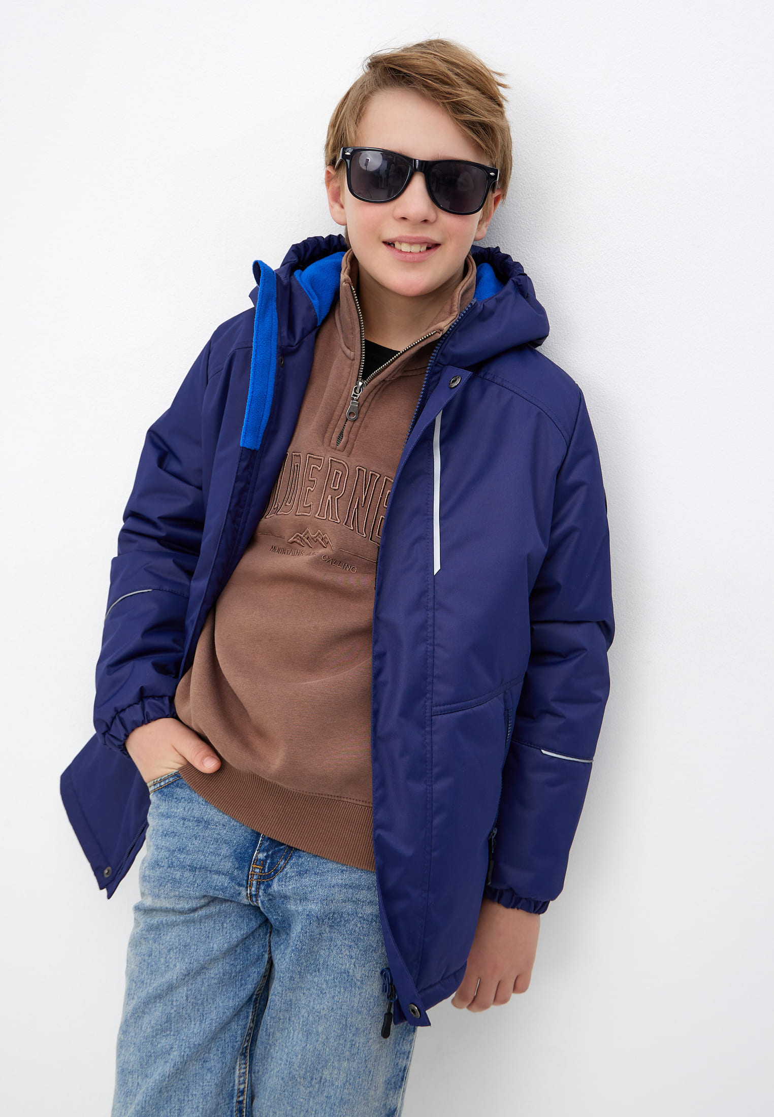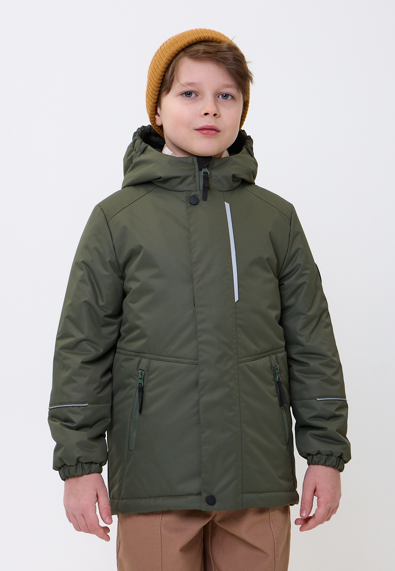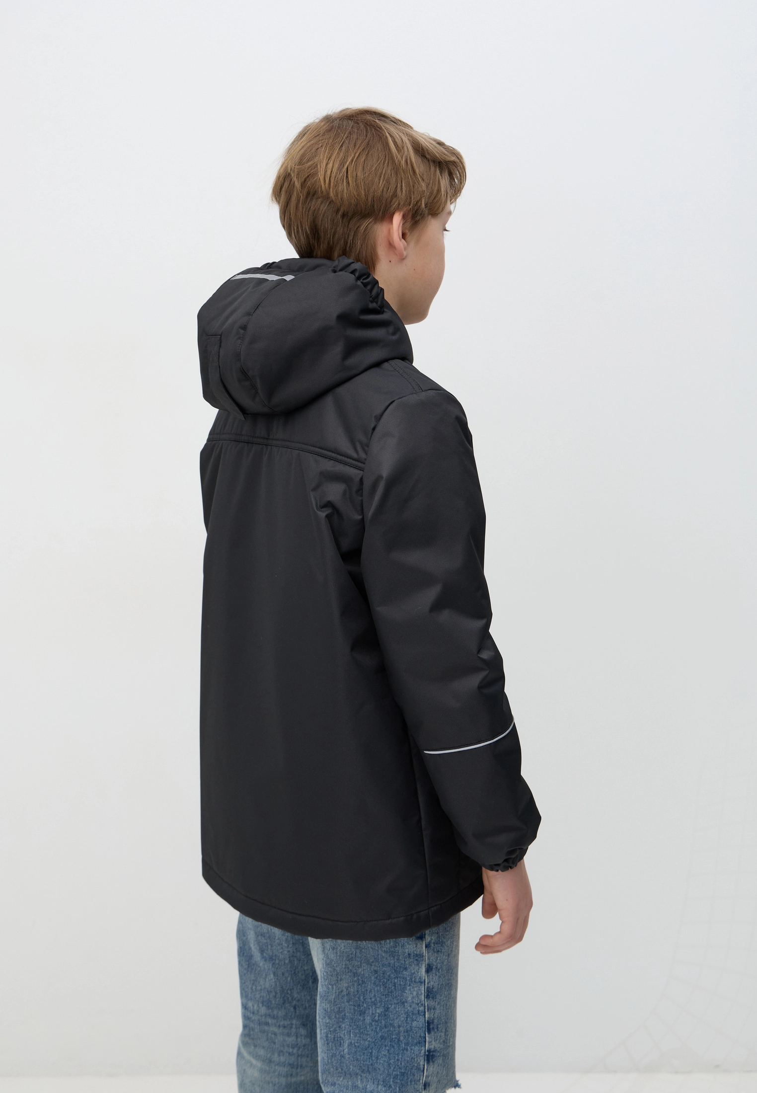 Демисезонная куртка для мальчиков на утеплителе, прямого силуэта, с втачным капюшоном. Центральная застёжка на молнию, закрытую центральной планкой на кнопках и липучке. По низу куртки кулиса с резиновым шнуром и фиксаторами для удобства прилегания. Низ рукава с отрезным манжетом на резинке. 2 прорезных кармана с молниями. По лицевому краю капюшона кулиса с резинкой. На центральной части капюшона хлястик и липучка для регулировки. Подкладка комбинированная с флисом. На левой подкладочной полочке – накладной карман с липучкой. Рассчитана на температуру от 0 до +15.