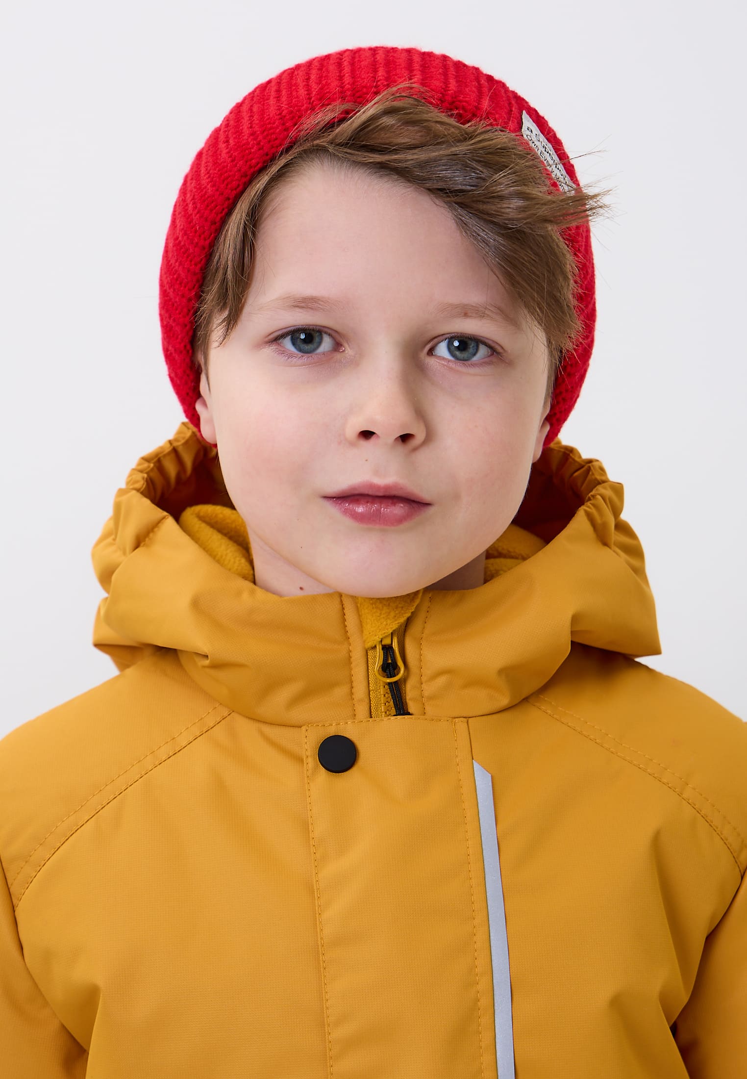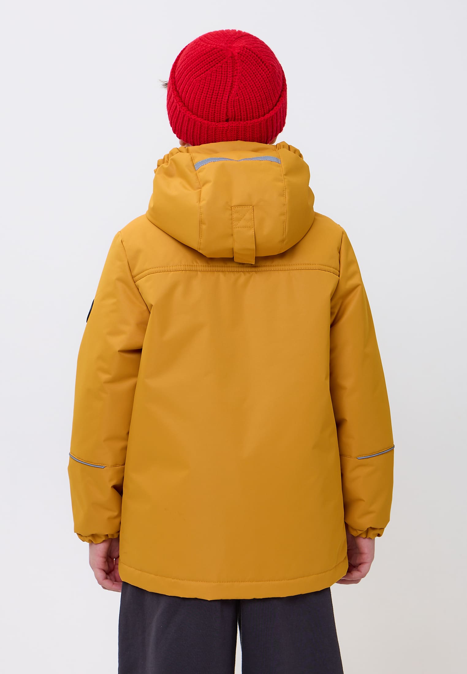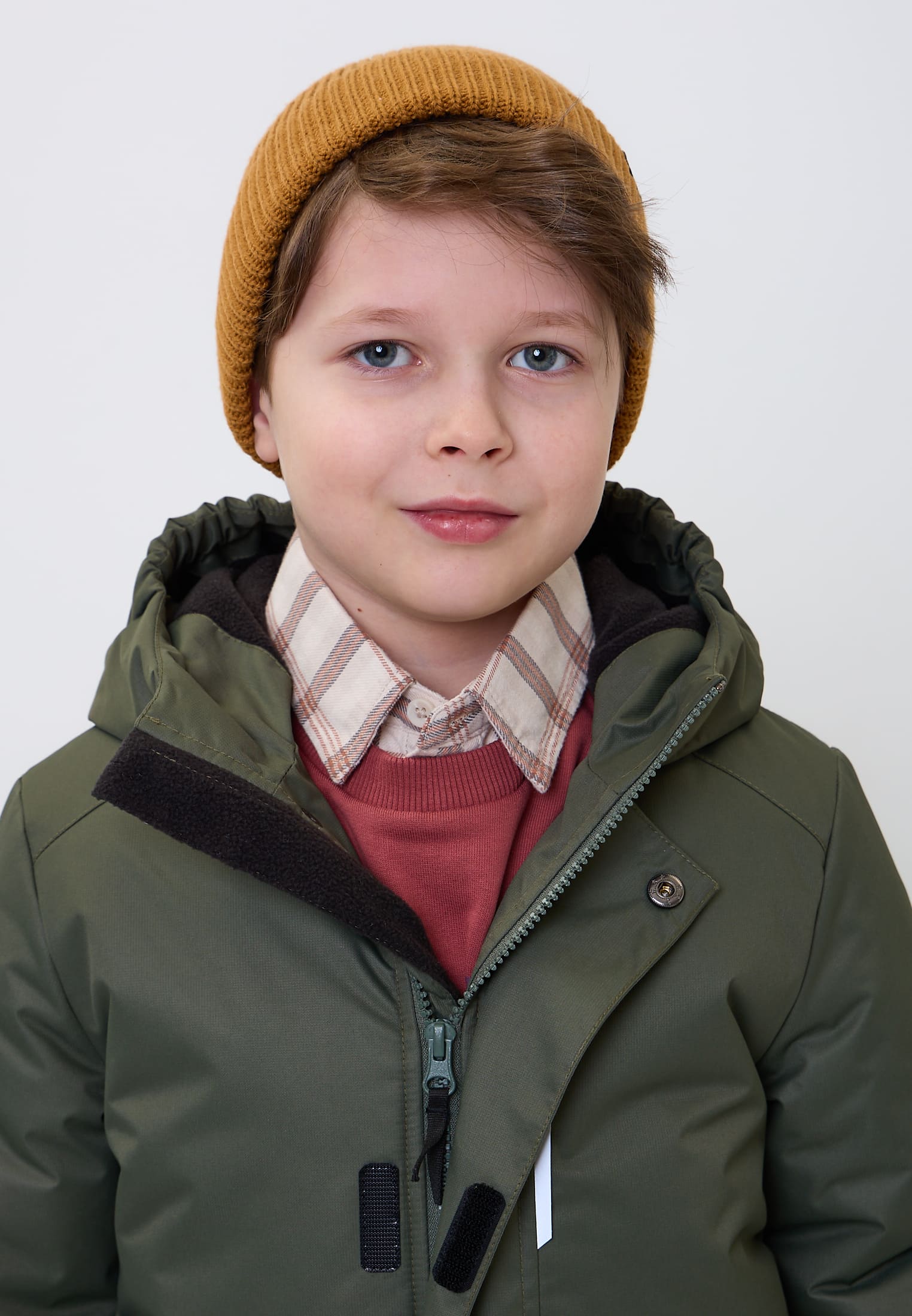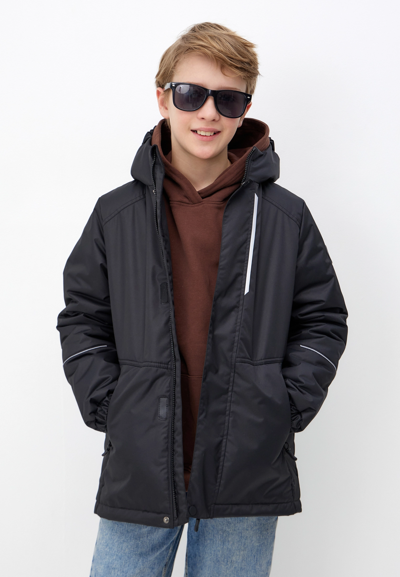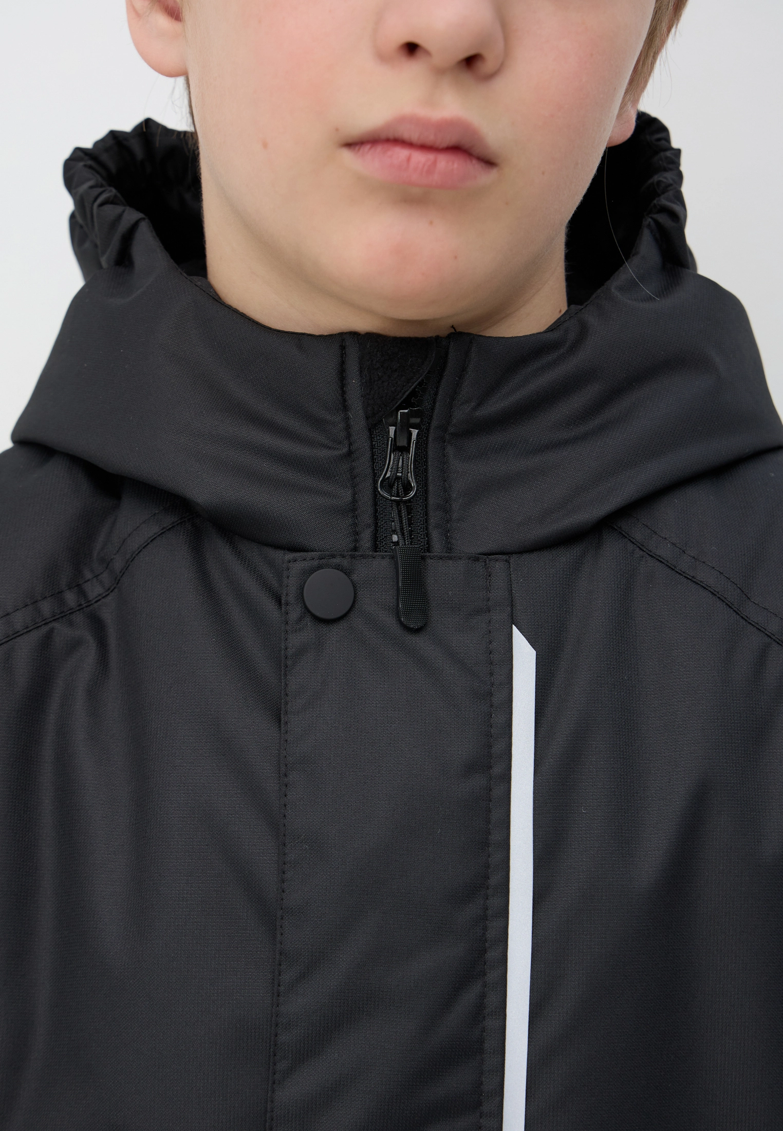 Демисезонная куртка для мальчиков на утеплителе, прямого силуэта, с втачным капюшоном. Центральная застёжка на молнию, закрытую центральной планкой на кнопках и липучке. По низу куртки кулиса с резиновым шнуром и фиксаторами для удобства прилегания. Низ рукава с отрезным манжетом на резинке. 2 прорезных кармана с молниями. По лицевому краю капюшона кулиса с резинкой. На центральной части капюшона хлястик и липучка для регулировки. Подкладка комбинированная с флисом. На левой подкладочной полочке – накладной карман с липучкой. Рассчитана на температуру от 0 до +15.