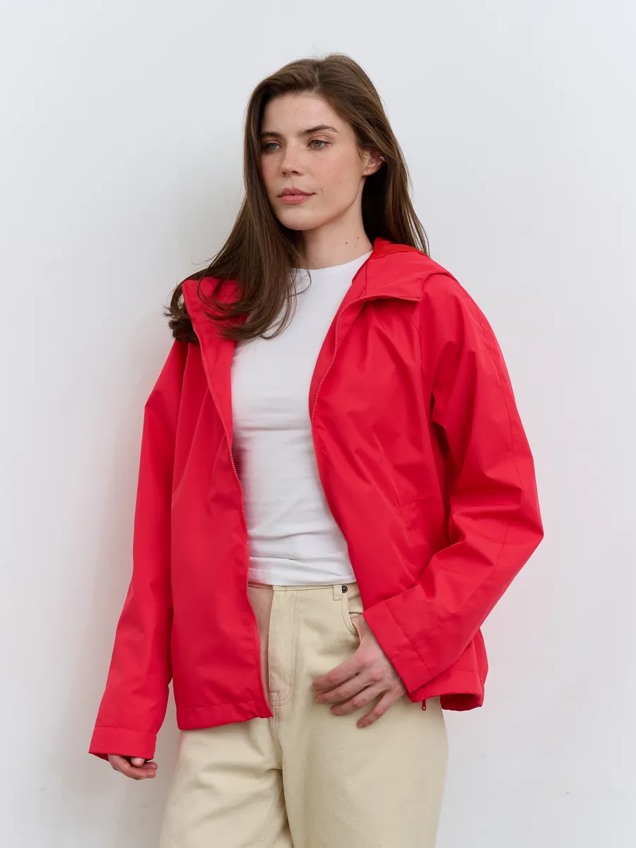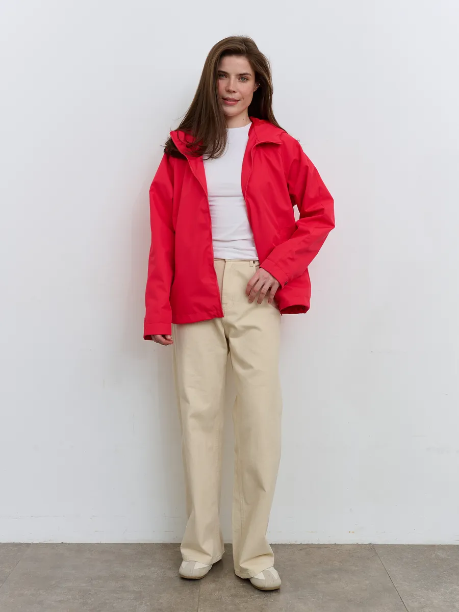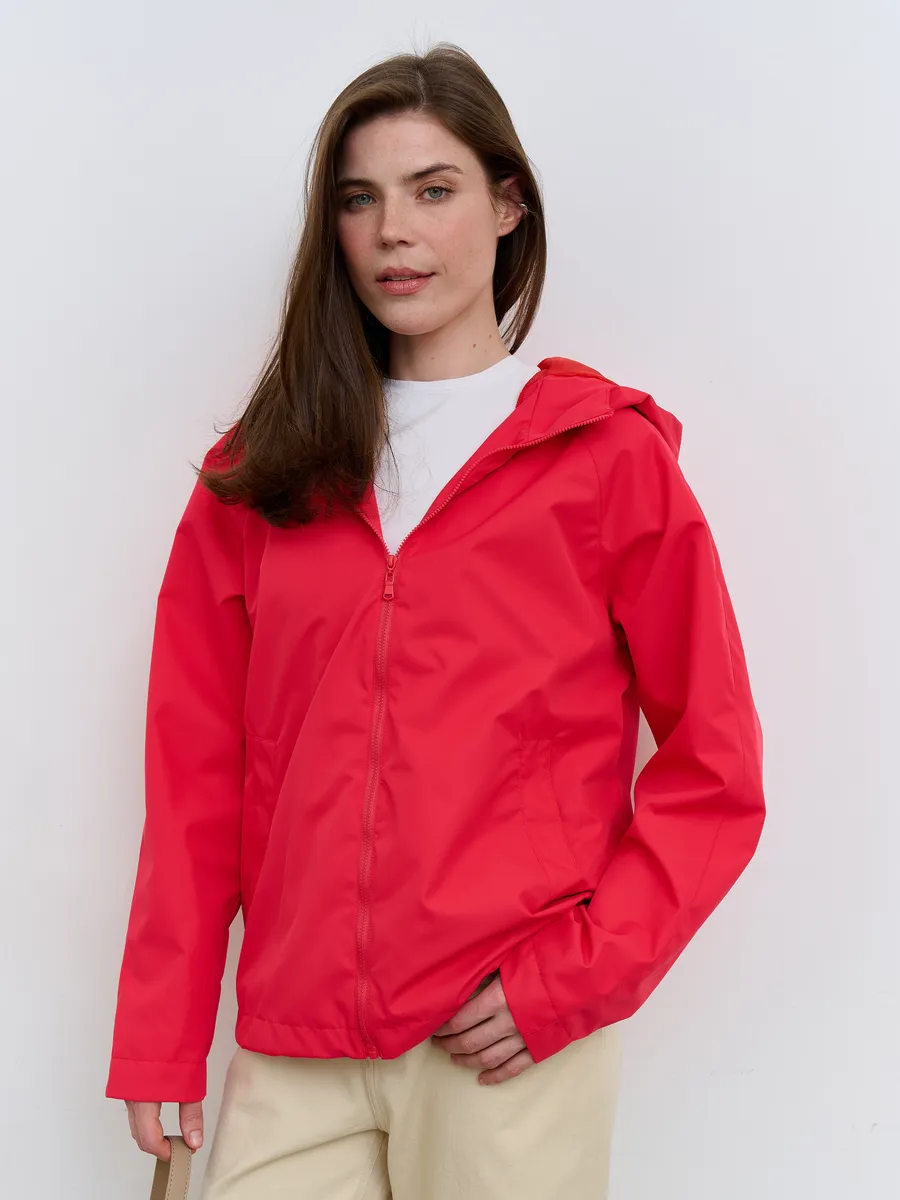 Укороченная ветровка для женщин на сетке, с втачным капюшоном и рукавами «реглан». Центральная застёжка – открытая молния. Карманы прорезные с листочками. По низу куртки кулиса с резиновым шнуром и фиксаторами для регулировки. Рассчитана на температуру от +15 до +20.