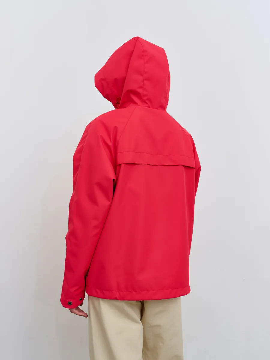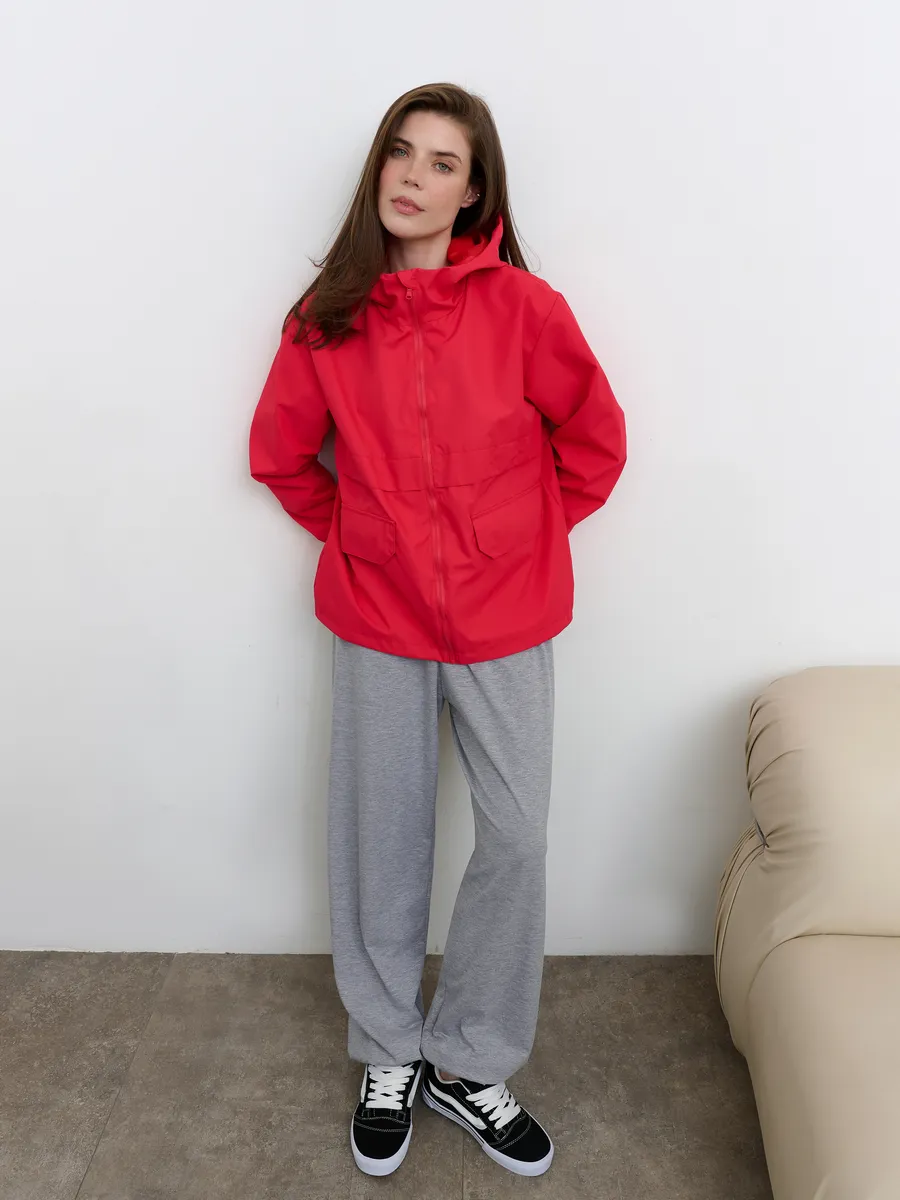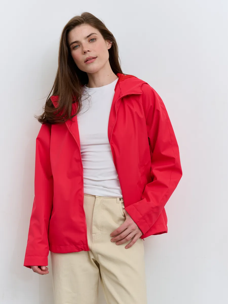 Укороченная ветровка для женщин на сетке, с втачным капюшоном и рукавами «реглан». Центральная застёжка – открытая молния. Карманы прорезные с листочками. По низу куртки кулиса с резиновым шнуром и фиксаторами для регулировки. Рассчитана на температуру от +15 до +20.