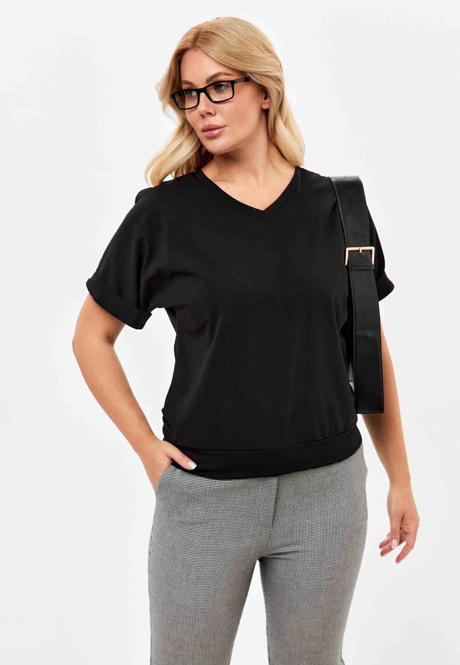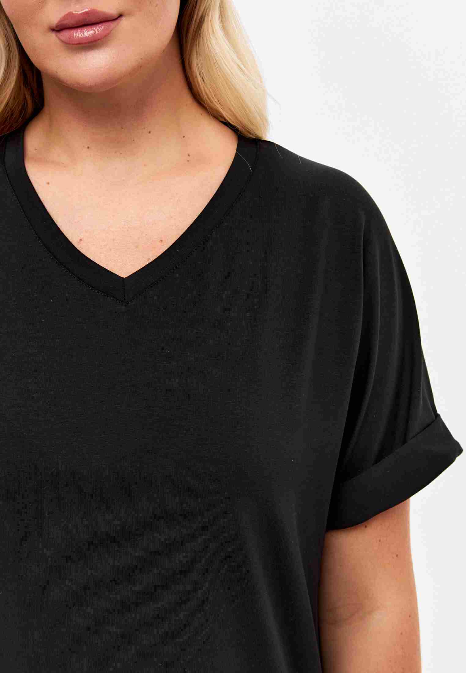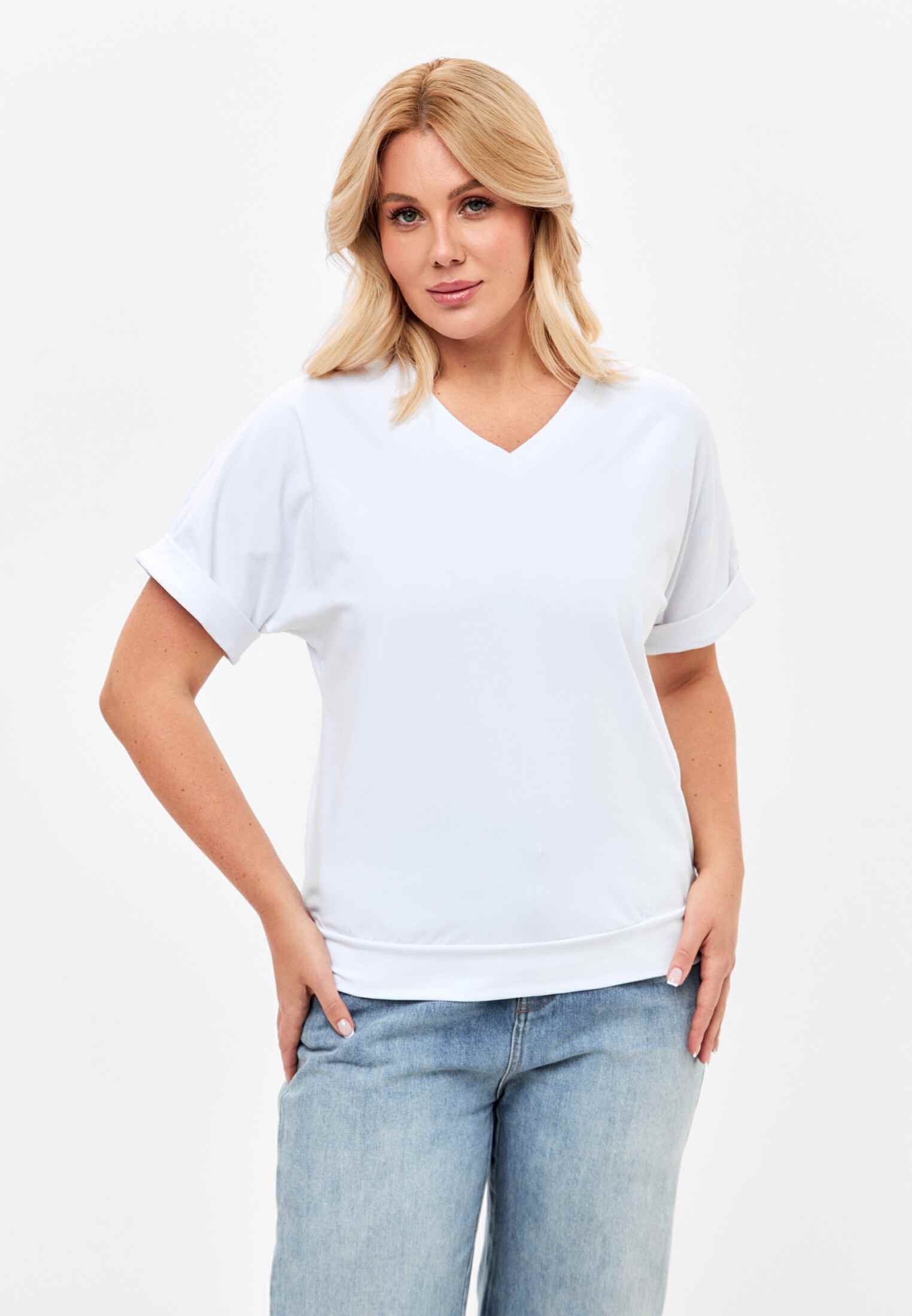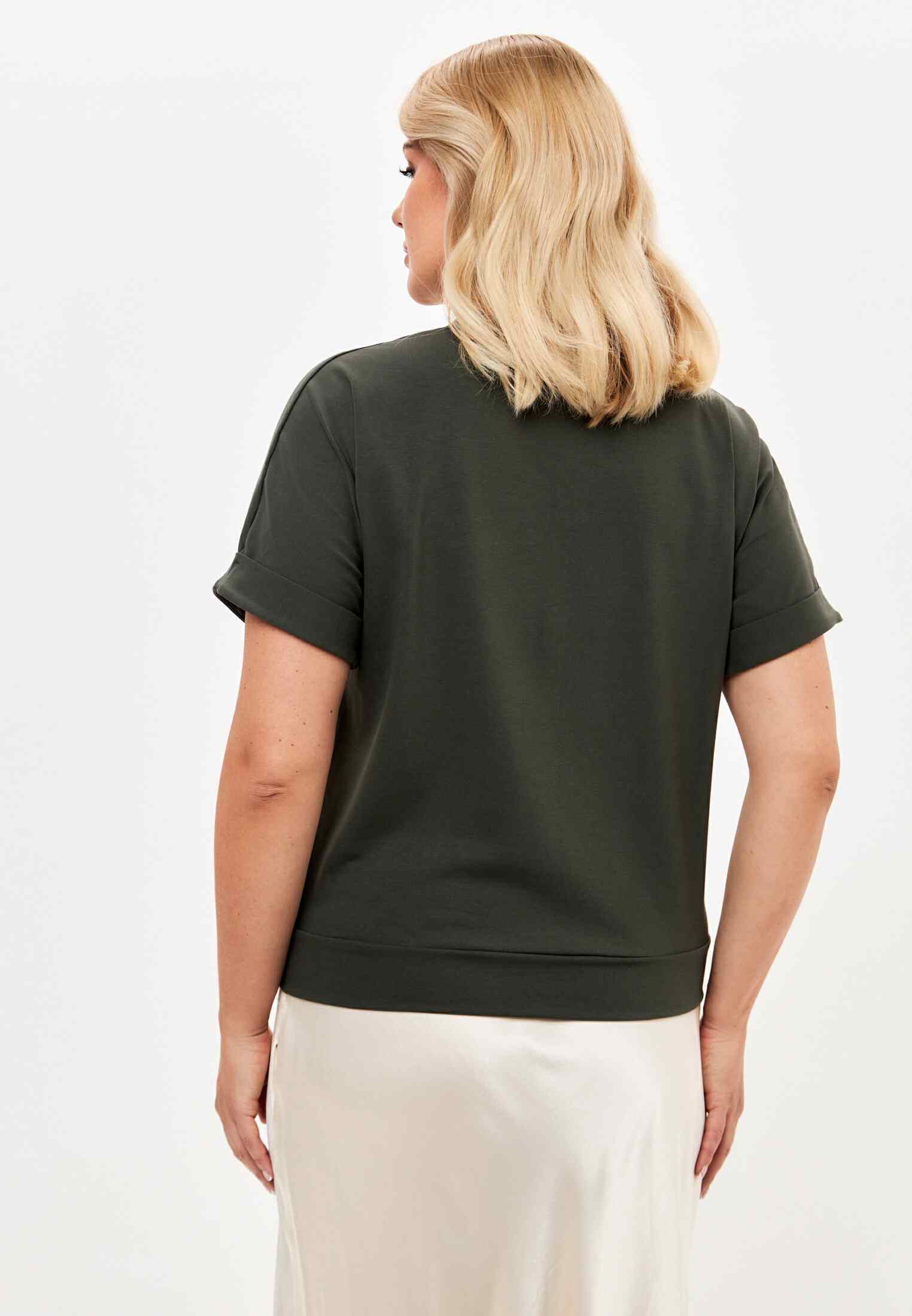 Женская футболка из кулирки, покроя кимоно. С V- образным вырезом горловины и притачным поясом по низу футболки. Горловина обработана бейкой из основной ткани. По низу рукавов манжеты.
