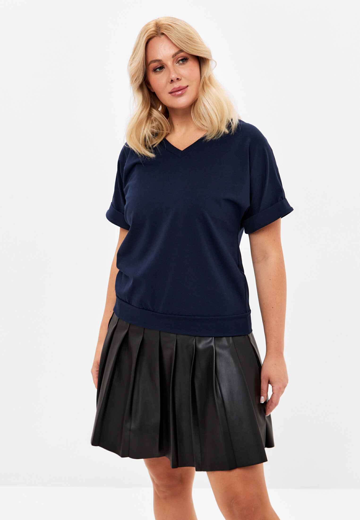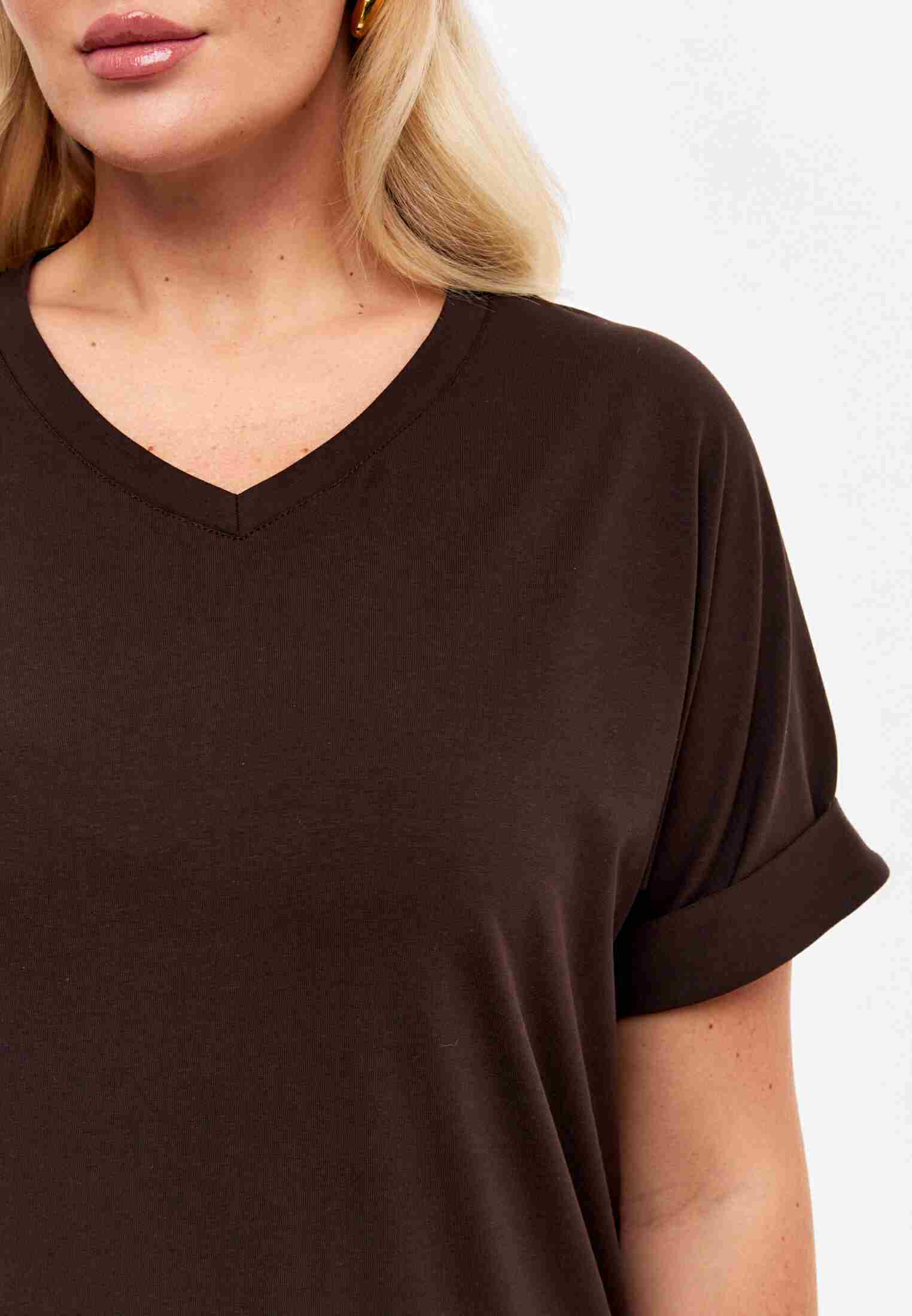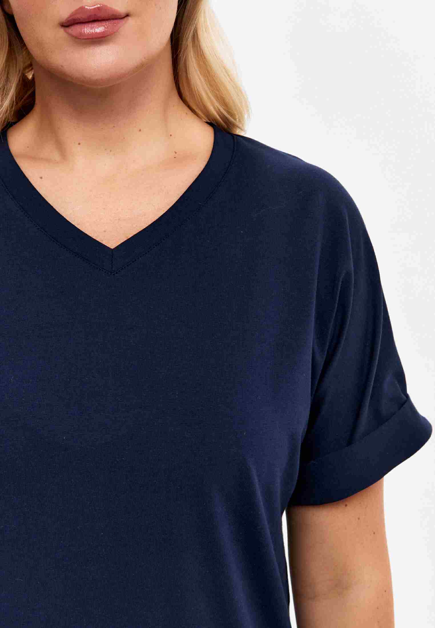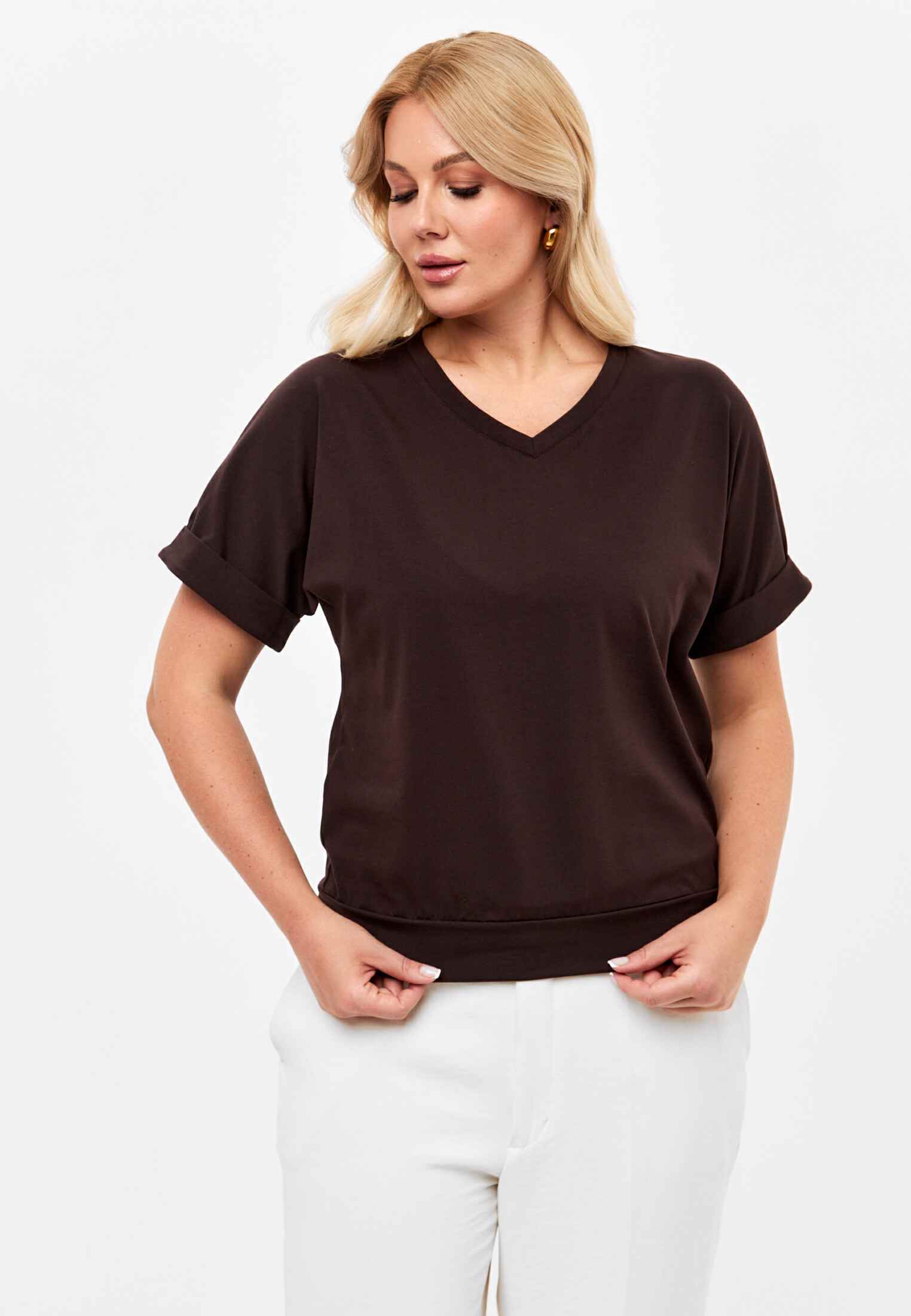Женская футболка из кулирки, покроя кимоно. С V- образным вырезом горловины и притачным поясом по низу футболки. Горловина обработана бейкой из основной ткани. По низу рукавов манжеты.