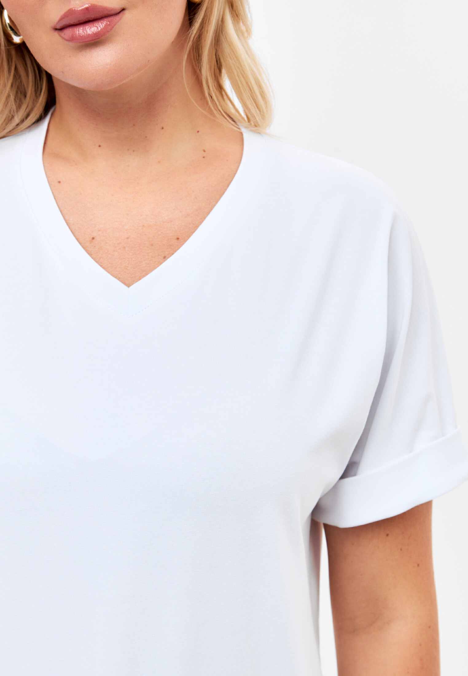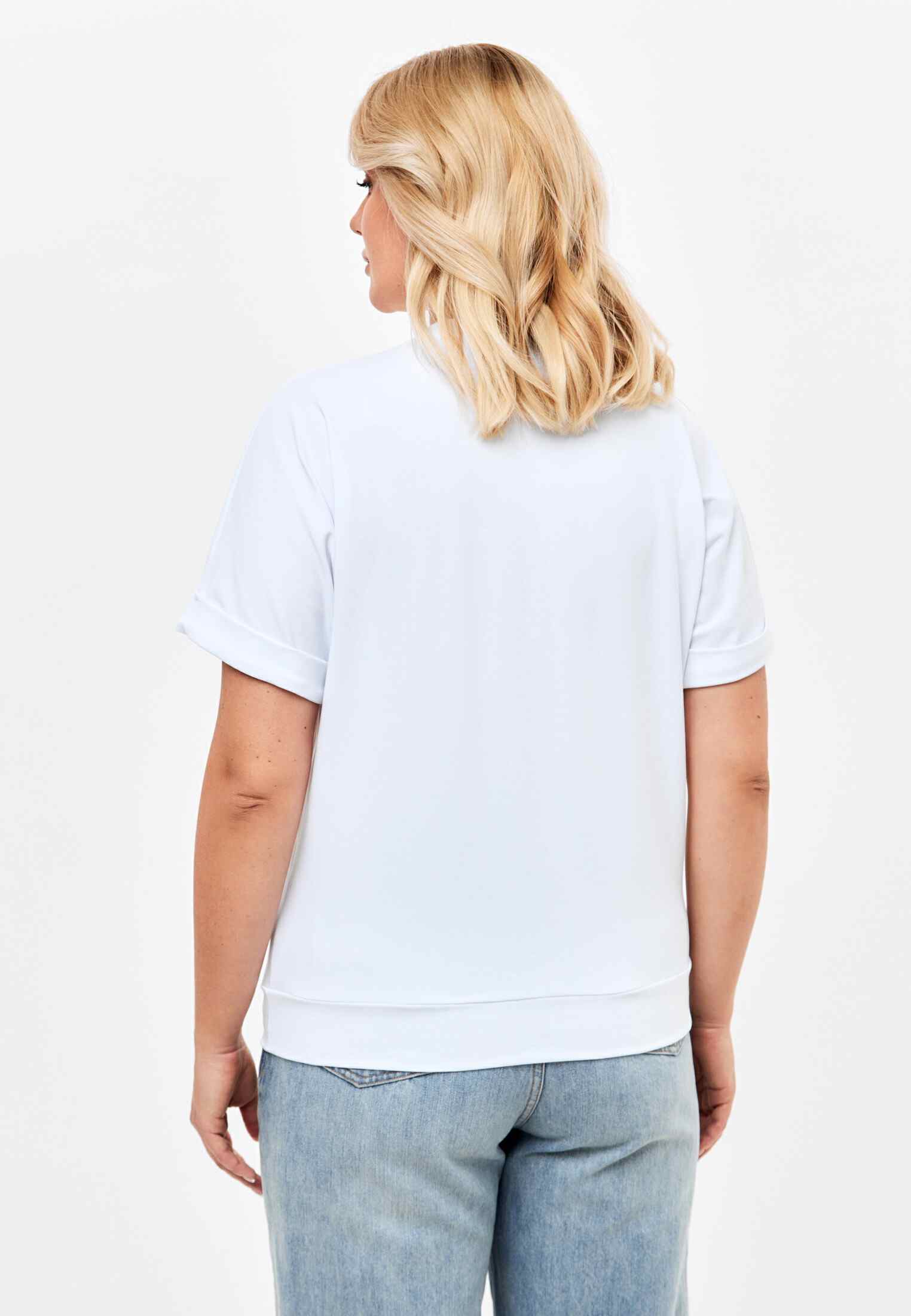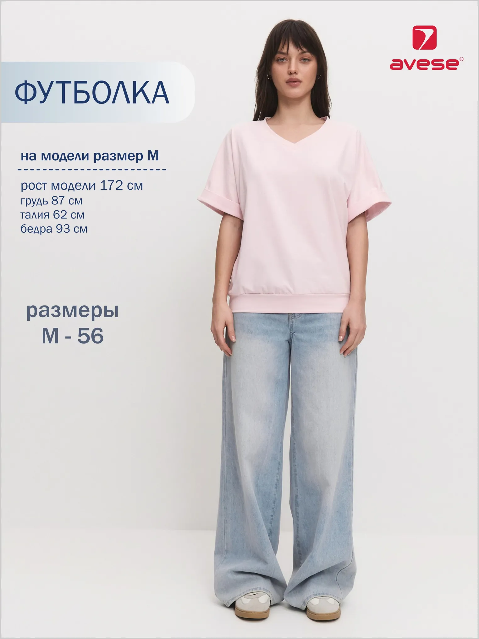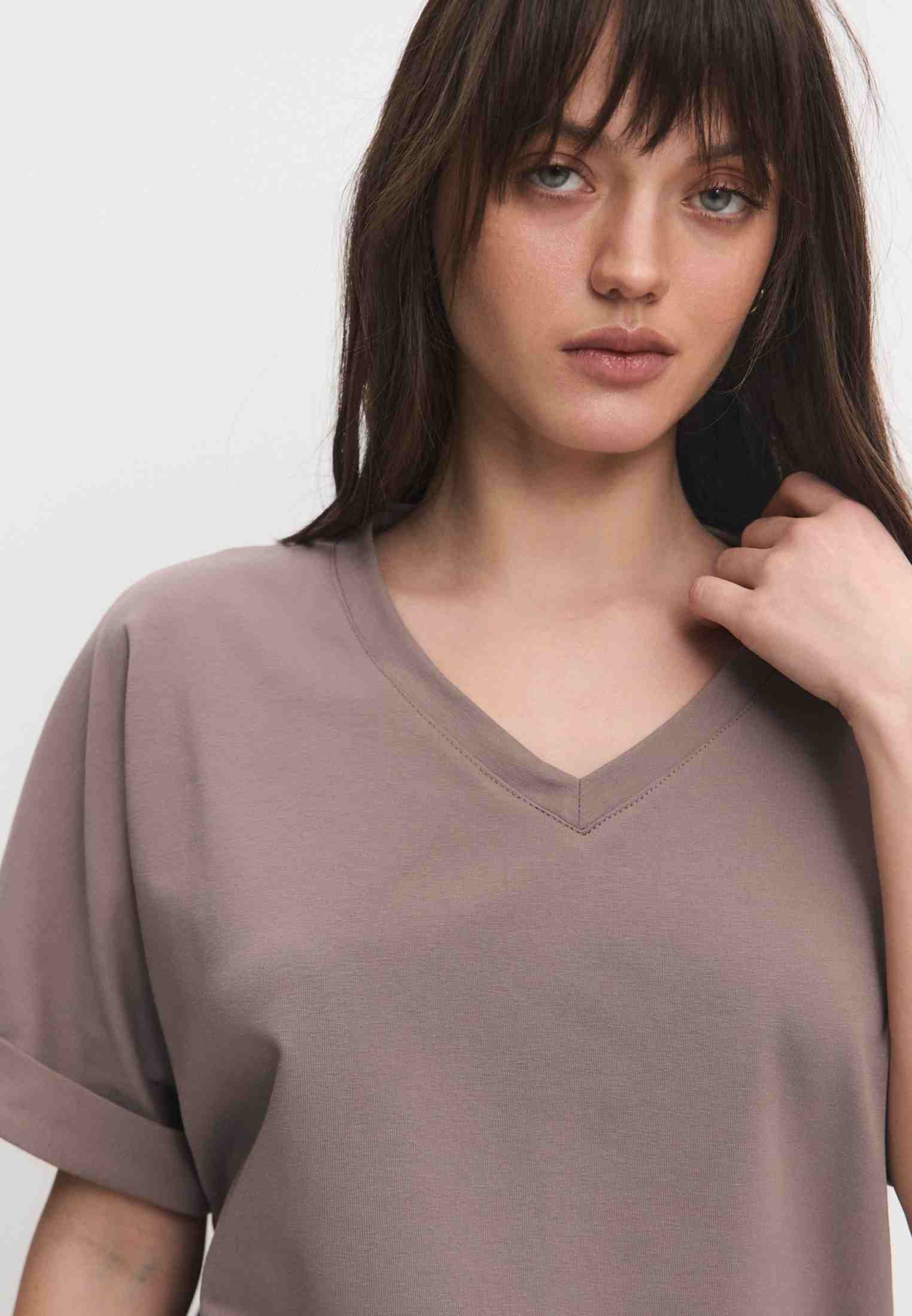 Женская футболка из кулирки, покроя кимоно. С V- образным вырезом горловины и притачным поясом по низу футболки. Горловина обработана бейкой из основной ткани. По низу рукавов манжеты.